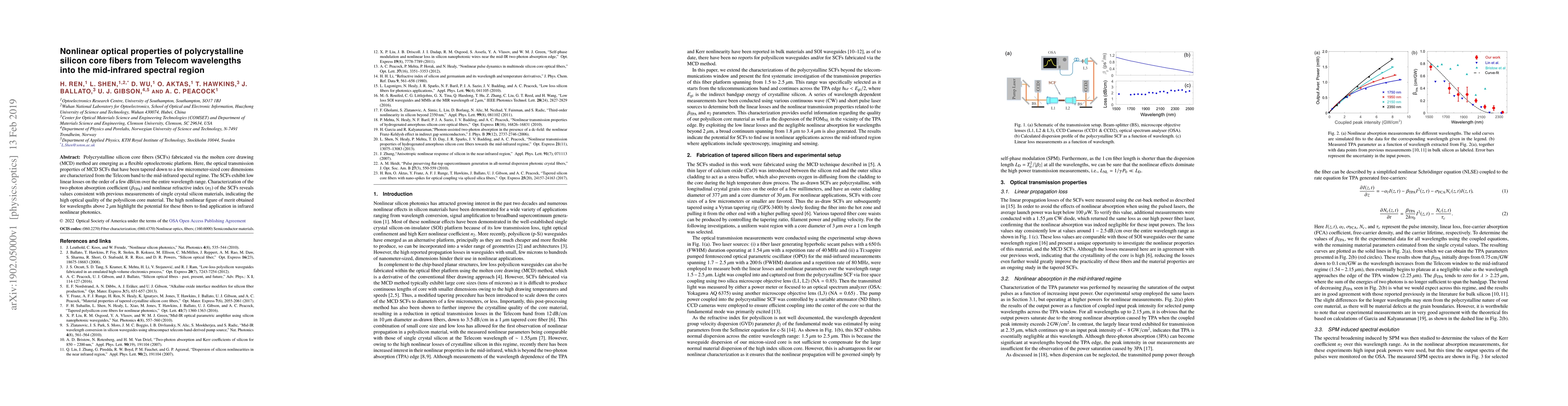 This paper investigates the nonlinear optical properties of polycrystalline silicon core fibers (SCFs) fabricated via the molten core drawing method, showing low linear losses and high nonlinear figures of merit in the mid-infrared region, indicating potential for infrared photonics applications. The fibers exhibit two-photon absorption and nonlinear refractive index values consistent with single crystal silicon, underscoring their optical quality.