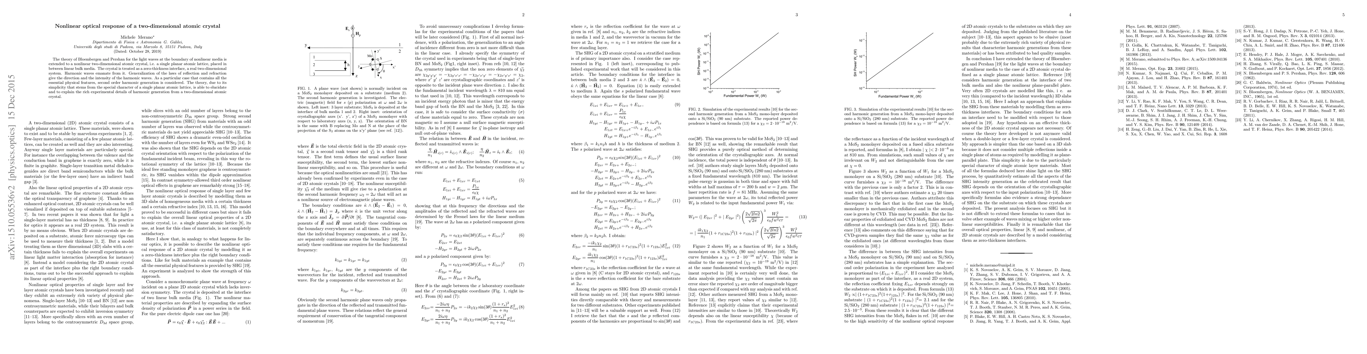 The theory of Bloembergen and Pershan for the light waves at the boundary of nonlinear media is extended to a nonlinear two-dimensional atomic crystal, i.e. a single planar atomic lattice, placed in between linear bulk media. The crystal is treated as a zero-thickness interface, a real two-dimensional system. Harmonic waves emanate from it. Generalization of the laws of reflection and refraction give the direction and the intensity of the harmonic waves. As a particular case that contains all the essential physical features, second order harmonic generation is considered. The theory, due to its simplicity that stems from the special character of a single planar atomic lattice, is able to elucidate and to explain the rich experimental details of harmonic generation from a two-dimensional atomic crystal.