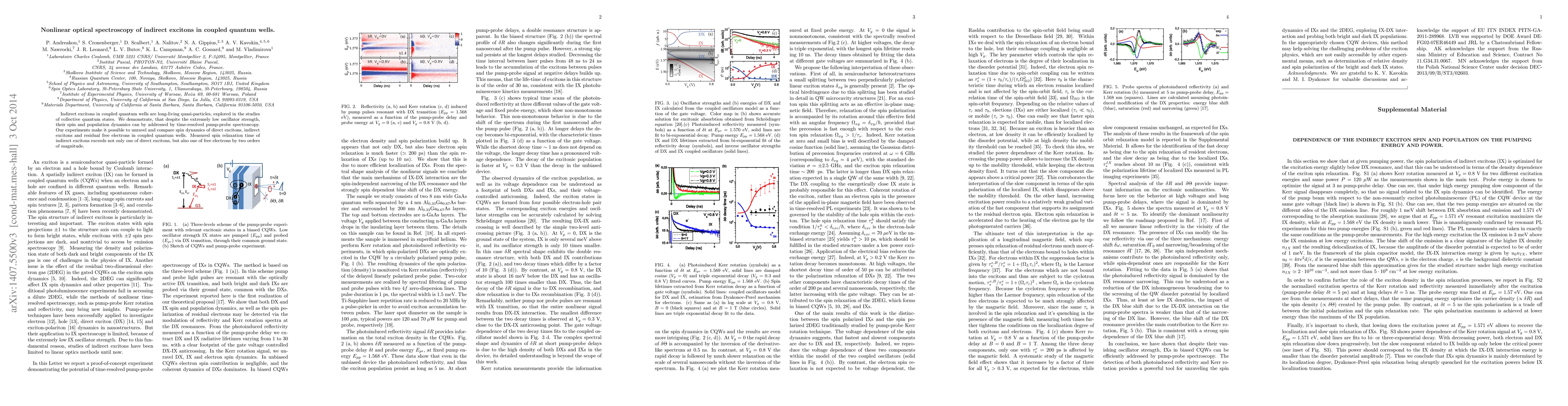 The paper presents a detailed nonlinear optical spectroscopy study of indirect excitons in biased CQWs, revealing their unique spin relaxation properties and distinct dynamics from the 2DEG.