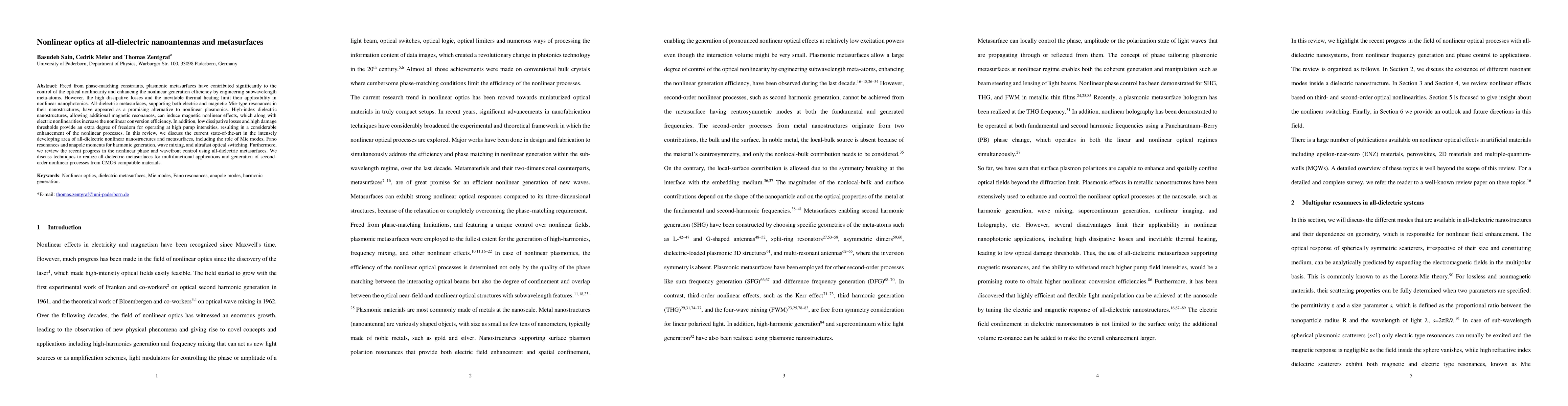 This paper reviews the state-of-the-art of nonlinear optics using all-dielectric nanoantennas and metasurfaces, highlighting their advantages over plasmonic counterparts in terms of reduced losses and higher efficiency for nonlinear optical processes like harmonic generation and wave mixing. It explores the role of Mie modes and other resonances in enhancing these processes and discusses recent advances in phase and wavefront control.