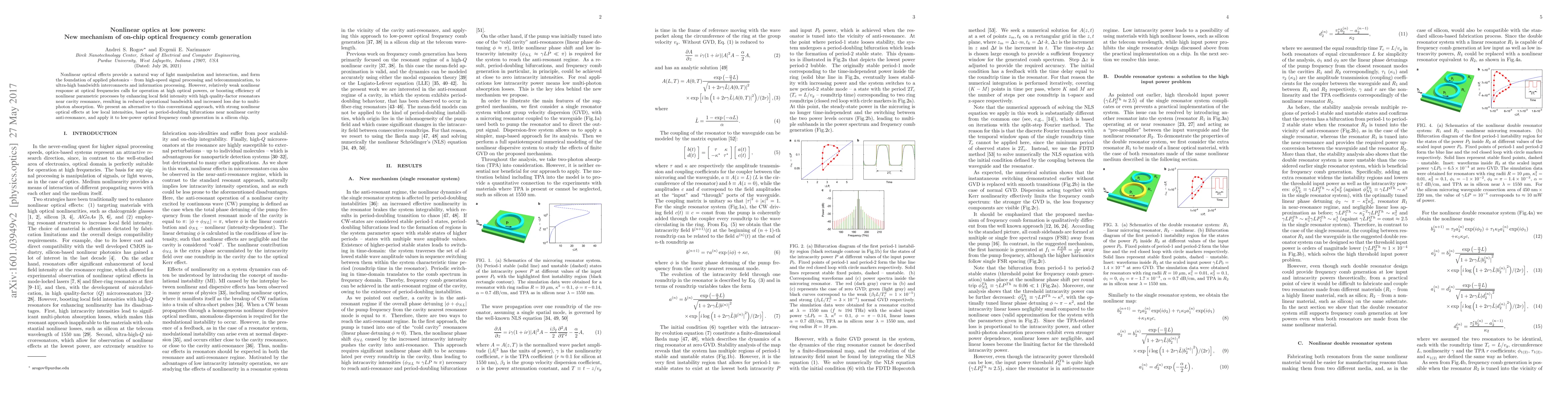 Nonlinear optical effects provide a natural way of light manipulation and interaction, and form the foundation of applied photonics -- from high-speed signal processing and telecommunication, to ultra-high bandwidth interconnects and information processing. However, relatively weak nonlinear response at optical frequencies calls for operation at high optical powers, or boosting efficiency of nonlinear parametric processes by enhancing local field intensity with high quality-factor resonators near cavity resonance, resulting in reduced operational bandwidth and increased loss due to multi-photon absorption. We present an alternative to this conventional approach, with strong nonlinear optical effects at low local intensities, based on period-doubling bifurcations near nonlinear cavity anti-resonance, and apply it to low-power optical comb generation in a silicon chip.