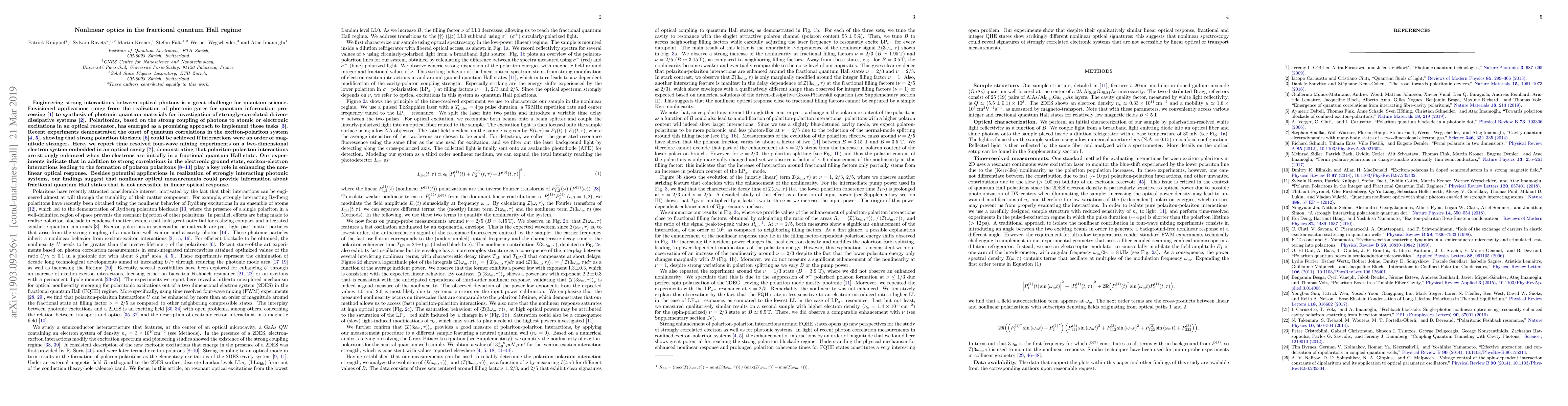 Engineering strong interactions between optical photons is a great challenge for quantum science. Envisioned applications range from the realization of photonic gates for quantum information processing to synthesis of photonic quantum materials for investigation of strongly-correlated driven-dissipative systems. Polaritonics, based on the strong coupling of photons to atomic or electronic excitations in an optical resonator, has emerged as a promising approach to implement those tasks. Recent experiments demonstrated the onset of quantum correlations in the exciton-polariton system, showing that strong polariton blockade could be achieved if interactions were an order of magnitude stronger. Here, we report time resolved four-wave mixing experiments on a two-dimensional electron system embedded in an optical cavity, demonstrating that polariton-polariton interactions are strongly enhanced when the electrons are initially in a fractional quantum Hall state. Our experiments indicate that in addition to strong correlations in the electronic ground state, exciton-electron interactions leading to the formation of polaron polaritons play a key role in enhancing the nonlinear optical response. Besides potential applications in realization of strongly interacting photonic systems, our findings suggest that nonlinear optical measurements could provide information about fractional quantum Hall states that is not accessible in linear optical response.