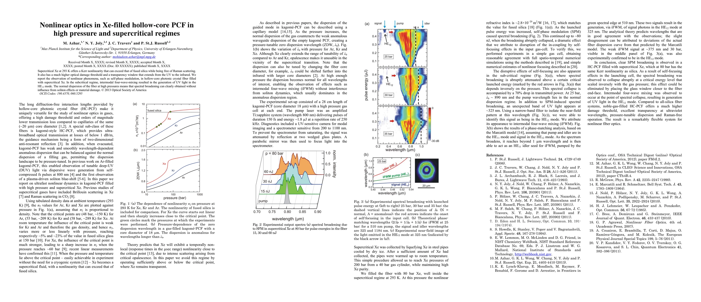 This paper investigates nonlinear optical phenomena in Xe-filled hollow-core photonic crystal fibers under high pressure and supercritical conditions. It demonstrates the superior Kerr nonlinearity and extended transparency window of supercritical Xe compared to fused silica, along with the generation of UV light via intermodal four-wave-mixing.