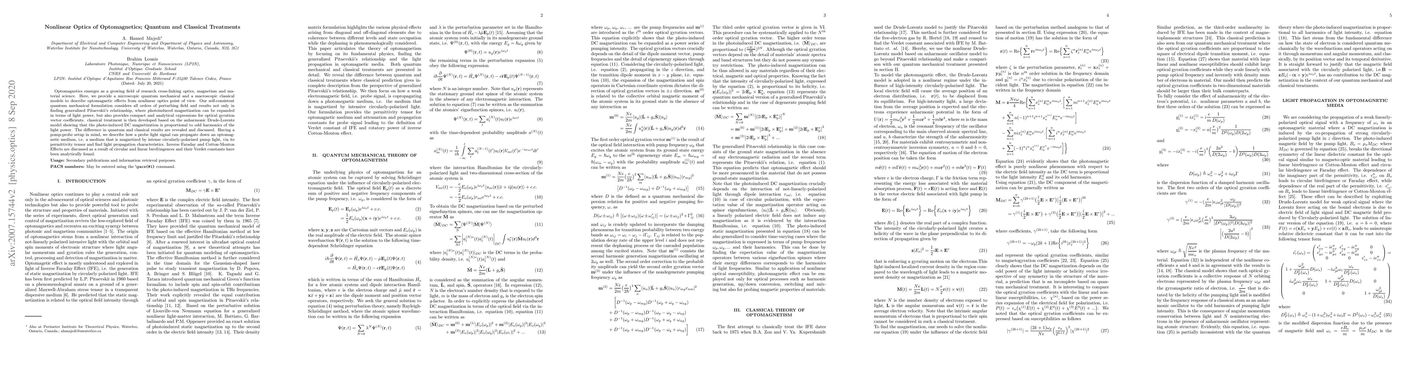 Optomagnetics emerges as a growing field of research cross-linking optics, magnetism and material science. Here, we provide a microscopic quantum mechanical and a macroscopic classical models to describe optomagnetic effects from nonlinear optics point of view. Our self-consistent quantum mechanical formulation considers all orders of perturbing field and results not only in finding generalized Pitaevskii's relationship, where photoinduced magnetization can be expanded in terms of light power, but also provide compact and analytical expressions for optical gyration vector coefficients. classical treatment is then developed based on the anharmonic Drude-Lorentz model showing that the photo-induced DC magnetization is proportional to odd harmonics of the light power. The difference in quantum and classical results are revealed and discussed. Having a pomp-probe setup in mind, we describe how a probe light signal can propagate down an optomagnetic medium, i.e. a medium that is magnetized by intense circularly-polarized pump light, via its permittivity tensor and find light propagation characteristics. Inverse Faraday and Cotton-Mouton Effects are discussed as a result of circular and linear birefringences and their Verdet constants have been analytically found.
