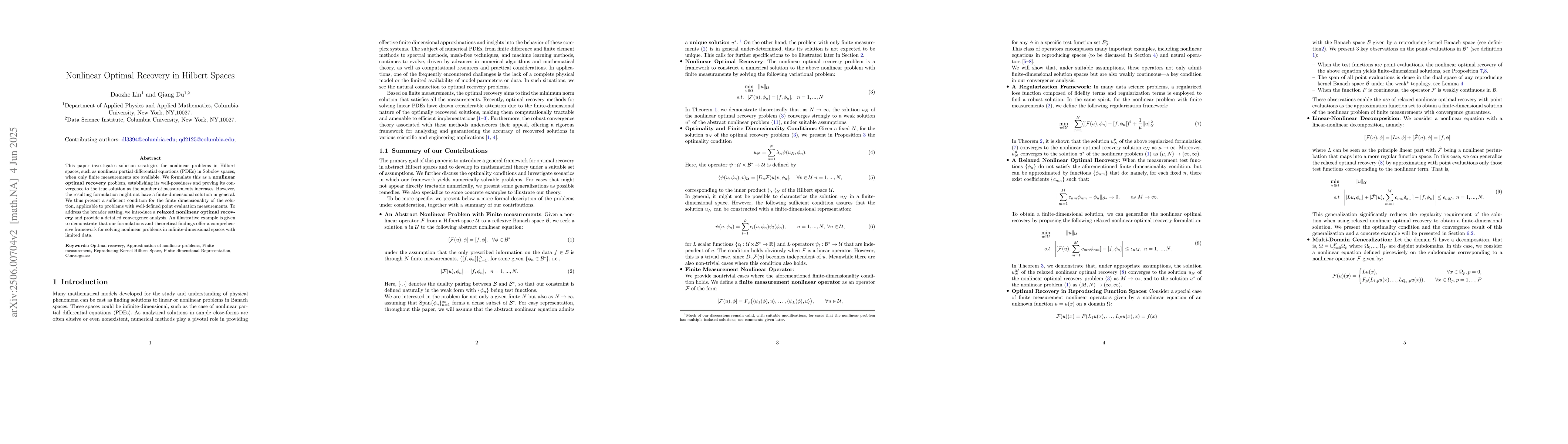 This paper investigates solution strategies for nonlinear problems in Hilbert spaces, such as nonlinear partial differential equations (PDEs) in Sobolev spaces, when only finite measurements are available. We formulate this as a nonlinear optimal recovery problem, establishing its well-posedness and proving its convergence to the true solution as the number of measurements increases. However, the resulting formulation might not have a finite-dimensional solution in general. We thus present a sufficient condition for the finite dimensionality of the solution, applicable to problems with well-defined point evaluation measurements. To address the broader setting, we introduce a relaxed nonlinear optimal recovery and provide a detailed convergence analysis. An illustrative example is given to demonstrate that our formulations and theoretical findings offer a comprehensive framework for solving nonlinear problems in infinite-dimensional spaces with limited data.