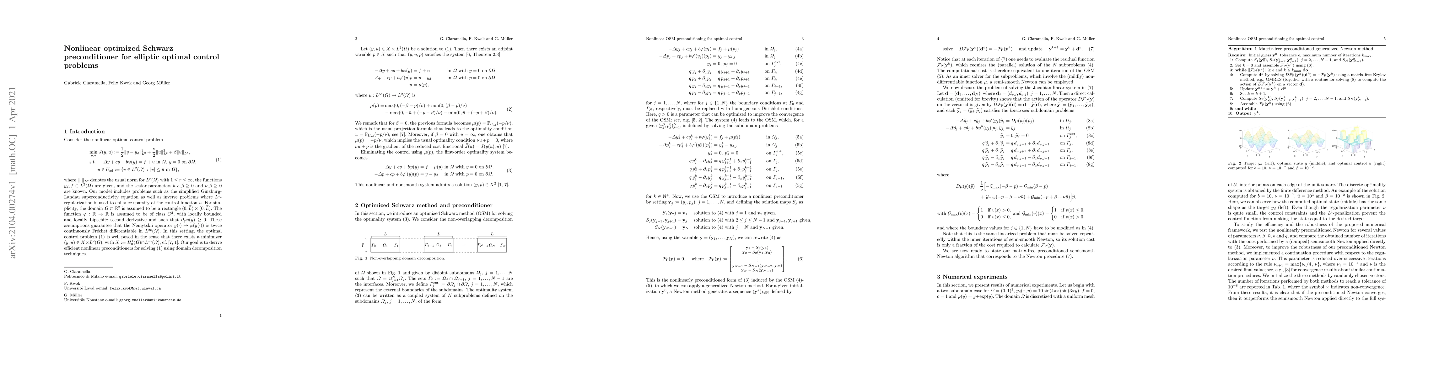 We introduce a domain decomposition-based nonlinear preconditioned iteration for solving nonlinear, nonsmooth elliptic optimal control problems, with a nonlinear reaction term, $L^1$ regularization and box constraints on the control function. The method is obtained by applying semismooth Newton to the fixed-point equation of the parallel optimized Schwarz iteration. As a proof of concept, numerical experiments are performed on two subdomains, as well as on a multi-subdomain test case. The results show that it is possible to obtain substantial improvements in robustness and efficiency with the new method, relative to semismooth Newton applied directly to the full optimization problem, provided appropriate Robin parameters and a good continuation strategy are chosen.