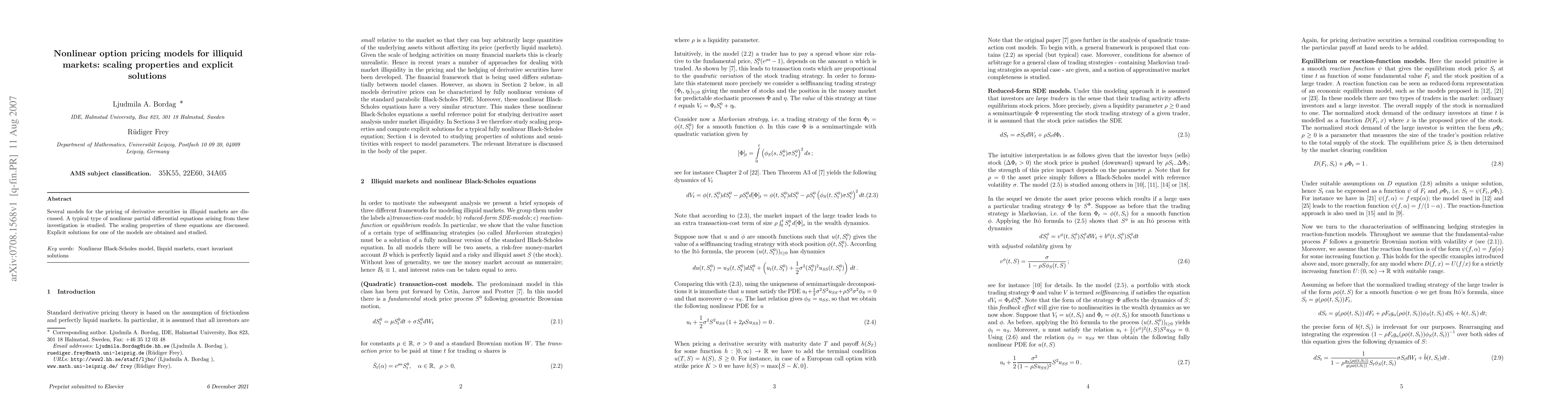 This paper explores nonlinear option pricing models for illiquid markets, focusing on the scaling properties of the associated nonlinear partial differential equations. It derives explicit solutions for one specific model and examines their implications.