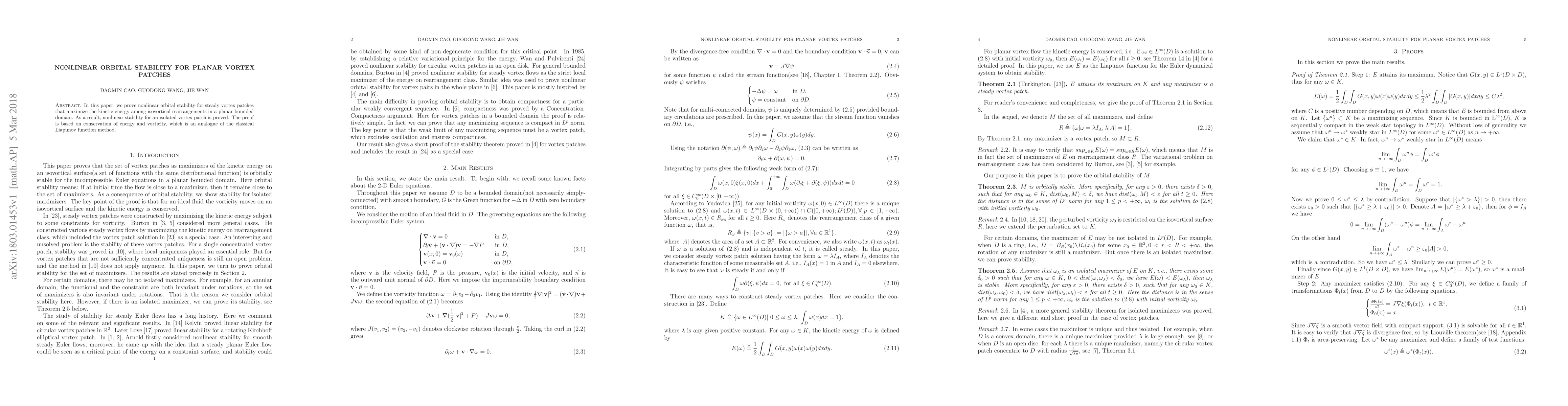 This paper proves nonlinear orbital stability for planar vortex patches that maximize kinetic energy within isovortical rearrangements. The stability proof leverages conservation principles of energy and vorticity, akin to the classical Liapunov function method.