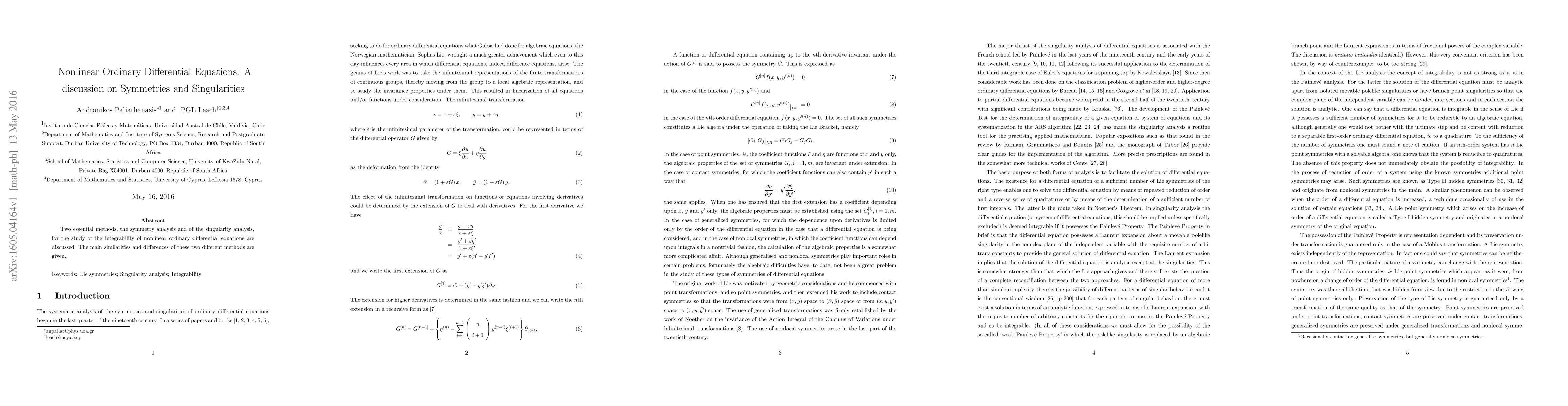 Two essential methods, the symmetry analysis and of the singularity analysis, for the study of the integrability of nonlinear ordinary differential equations are discussed. The main similarities and differences of these two different methods are given.