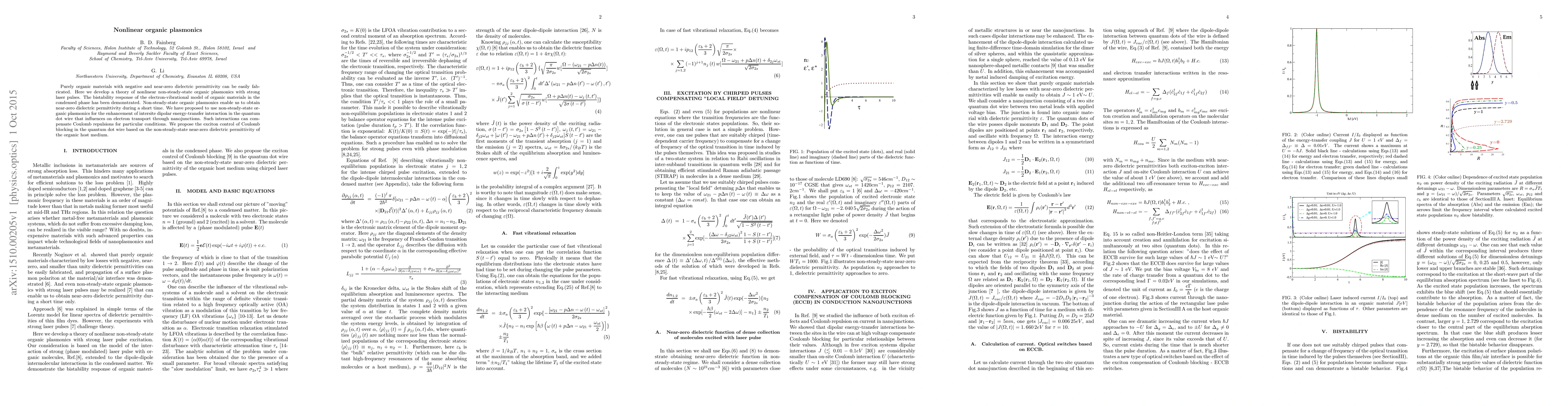 This paper develops a theory for nonlinear non-steady-state organic plasmonics using strong laser pulses to achieve near-zero dielectric permittivity in organic materials. The proposed method aims to enhance intersite dipolar energy-transfer interactions in quantum dot wires, potentially compensating for Coulomb repulsions and controlling exciton-based Coulomb blocking.