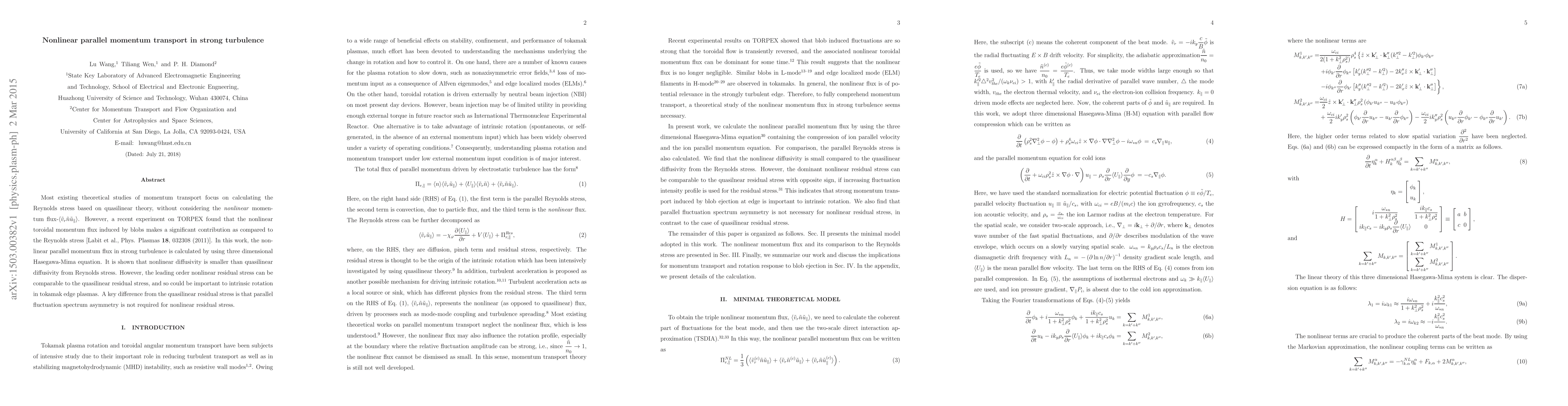 This paper investigates the nonlinear parallel momentum transport in strong turbulence using the three-dimensional Hasegawa-Mima equation, finding that while nonlinear diffusivity is smaller than quasilinear diffusivity, the leading order nonlinear residual stress can be comparable to quasilinear stress, potentially impacting intrinsic rotation in tokamak edge plasmas without requiring parallel fluctuation spectrum asymmetry.