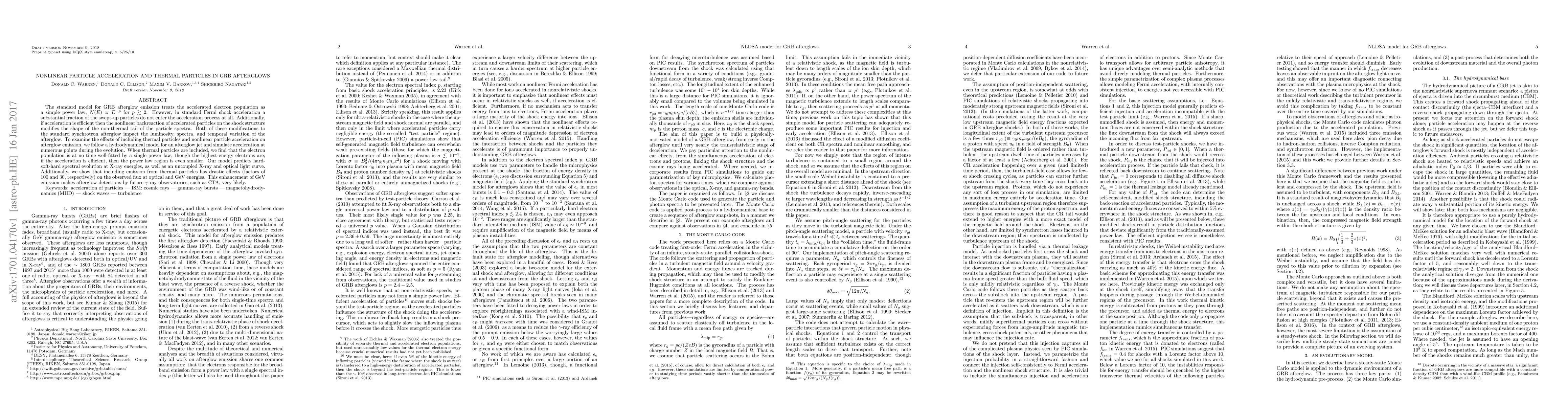 The standard model for GRB afterglow emission treats the accelerated electron population as a simple power law, $N(E) \propto E^{-p}$ for $p \gtrsim 2$. However, in standard Fermi shock acceleration a substantial fraction of the swept-up particles do not enter the acceleration process at all. Additionally, if acceleration is efficient then the nonlinear backreaction of accelerated particles on the shock structure modifies the shape of the non-thermal tail of the particle spectra. Both of these modifications to the standard synchrotron afterglow impact the luminosity, spectra, and temporal variation of the afterglow. To examine the effects of including thermal particles and nonlinear particle acceleration on afterglow emission, we follow a hydrodynamical model for an afterglow jet and simulate acceleration at numerous points during the evolution. When thermal particles are included, we find that the electron population is at no time well-fitted by a single power law, though the highest-energy electrons are; if the acceleration is efficient, then the power law region is even smaller. Our model predicts hard-soft-hard spectral evolution at X-ray energies, as well as an uncoupled X-ray and optical light curve. Additionally, we show that including emission from thermal particles has drastic effects (factors of 100 and 30, respectively) on the observed flux at optical and GeV energies. This enhancement of GeV emission makes afterglow detections by future $\gamma$-ray observatories, such as CTA, very likely.
