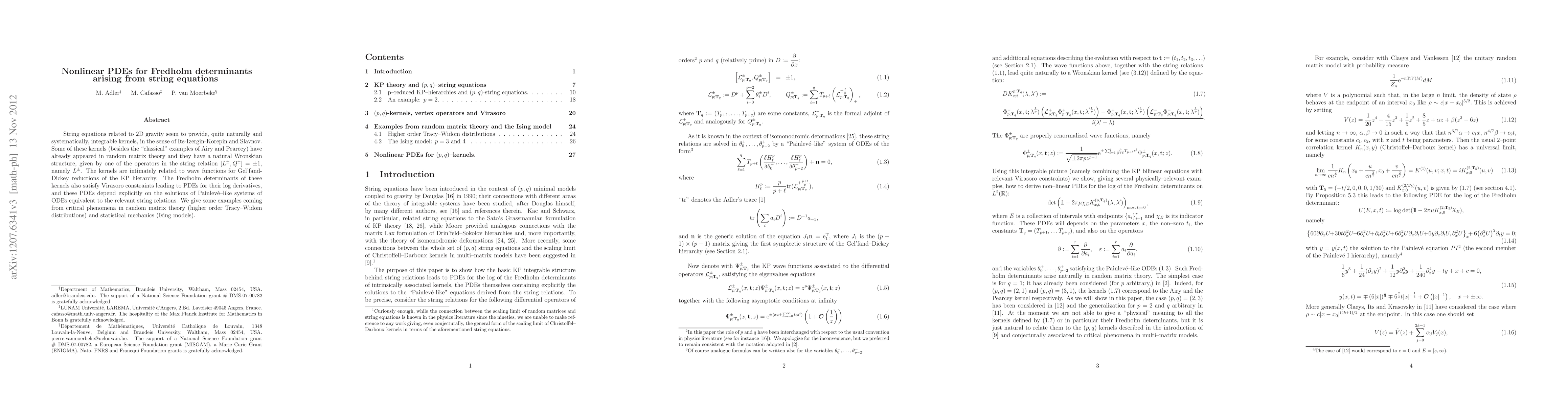 String equations in 2D gravity produce integrable kernels related to random matrix theory and statistical mechanics, with Fredholm determinants satisfying Virasoro constraints and dependent on Painlevé-like ODEs.