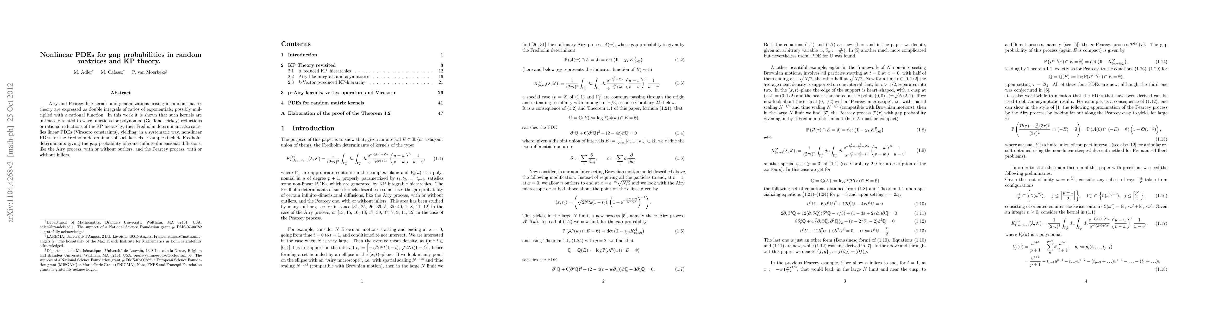 This paper explores the connection between random matrix theory and the KP-hierarchy, showing that Airy and Pearcey-like kernels can be expressed as double integrals of exponential ratios. It demonstrates that these kernels relate to wave functions for polynomial or rational reductions of the KP-hierarchy, leading to systematic nonlinear PDEs for the Fredholm determinant, which describe gap probabilities in infinite-dimensional diffusions.