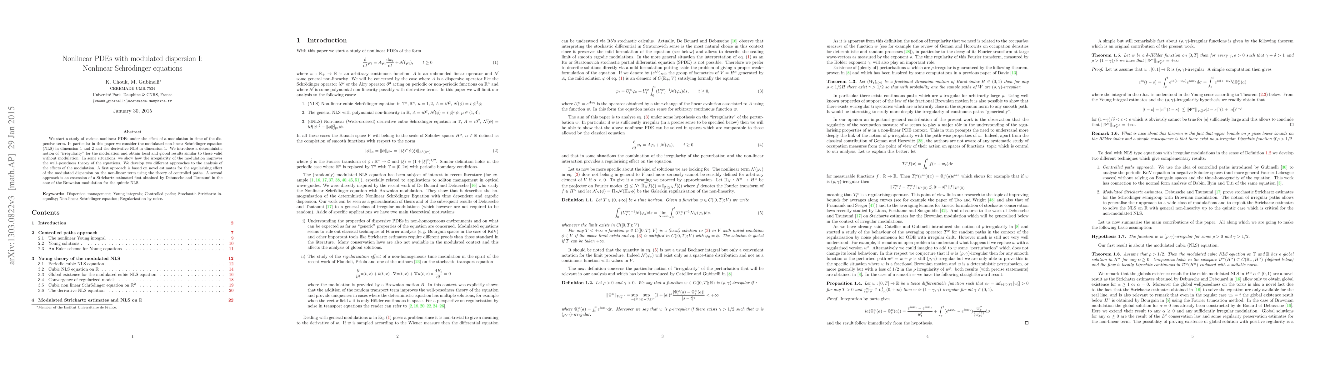 We start a study of various nonlinear PDEs under the effect of a modulation in time of the dispersive term. In particular in this paper we consider the modulated non-linear Schr\"odinger equation (NLS) in dimension 1 and 2 and the derivative NLS in dimension 1. We introduce a deterministic notion of "irregularity" for the modulation and obtain local and global results similar to those valid without modulation. In some situations, we show how the irregularity of the modulation improves the well--posedness theory of the equations. We develop two different approaches to the analysis of the effects of the modulation. A first approach is based on novel estimates for the regularising effect of the modulated dispersion on the non-linear term using the theory of controlled paths. A second approach is an extension of a Strichartz estimated first obtained by Debussche and Tsutsumi in the case of the Brownian modulation for the quintic NLS.