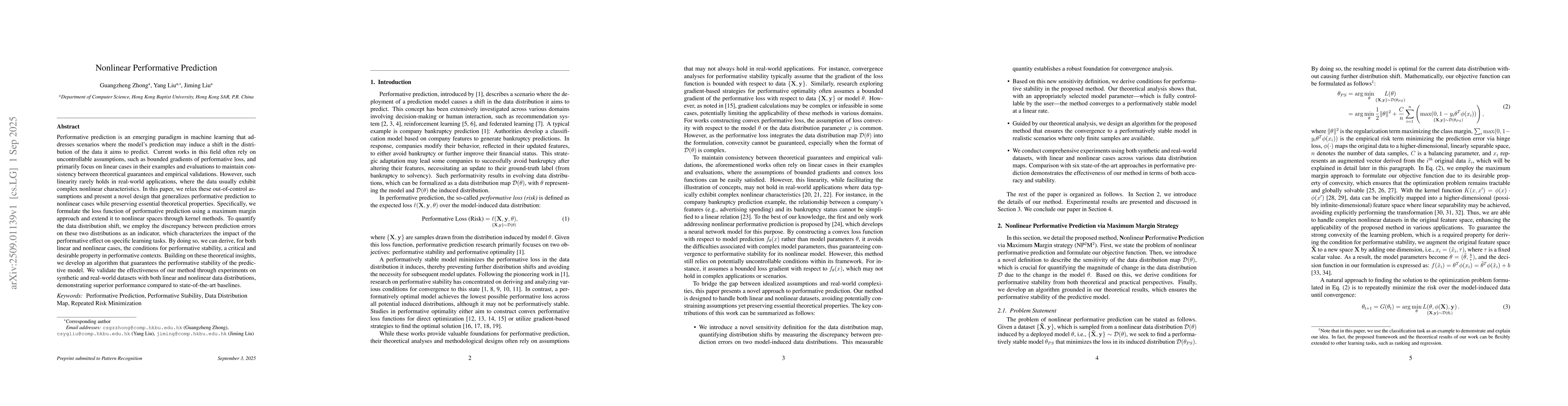 Performative prediction is an emerging paradigm in machine learning that addresses scenarios where the model's prediction may induce a shift in the distribution of the data it aims to predict. Current works in this field often rely on uncontrollable assumptions, such as bounded gradients of performative loss, and primarily focus on linear cases in their examples and evaluations to maintain consistency between theoretical guarantees and empirical validations. However, such linearity rarely holds in real-world applications, where the data usually exhibit complex nonlinear characteristics. In this paper, we relax these out-of-control assumptions and present a novel design that generalizes performative prediction to nonlinear cases while preserving essential theoretical properties. Specifically, we formulate the loss function of performative prediction using a maximum margin approach and extend it to nonlinear spaces through kernel methods. To quantify the data distribution shift, we employ the discrepancy between prediction errors on these two distributions as an indicator, which characterizes the impact of the performative effect on specific learning tasks. By doing so, we can derive, for both linear and nonlinear cases, the conditions for performative stability, a critical and desirable property in performative contexts. Building on these theoretical insights, we develop an algorithm that guarantees the performative stability of the predictive model. We validate the effectiveness of our method through experiments on synthetic and real-world datasets with both linear and nonlinear data distributions, demonstrating superior performance compared to state-of-the-art baselines.