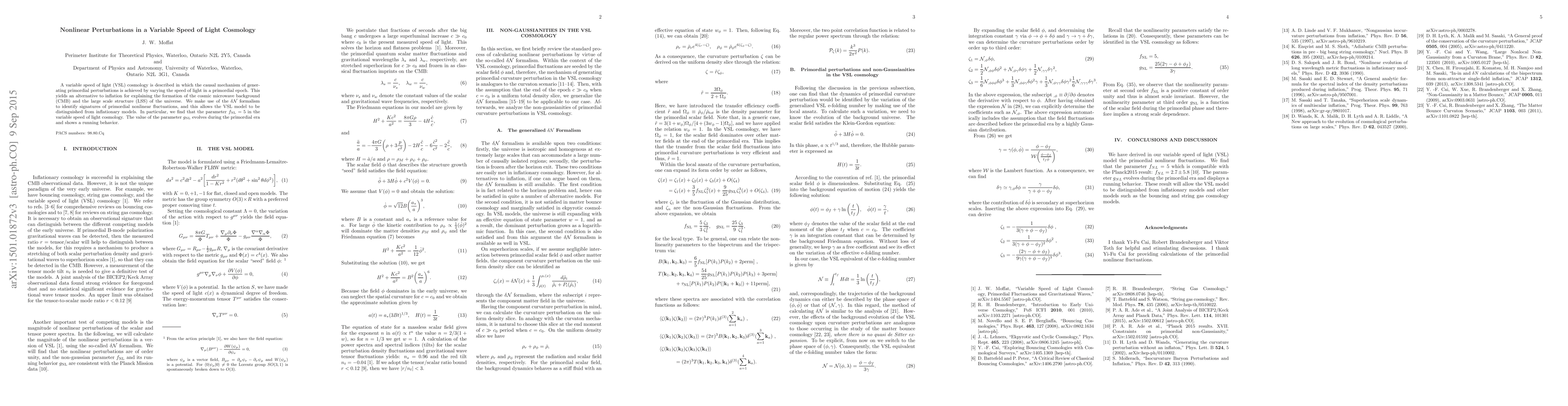 This paper explores a variable speed of light cosmology that uses varying light speed in a primordial epoch to generate cosmic perturbations, offering an alternative to inflation. It employs the $\delta{\cal N}$ formalism to identify nonlinear fluctuations, distinguishing it from inflationary models with parameters $f_{\rm NL}=5$ and a running $g_{\rm NL}$.