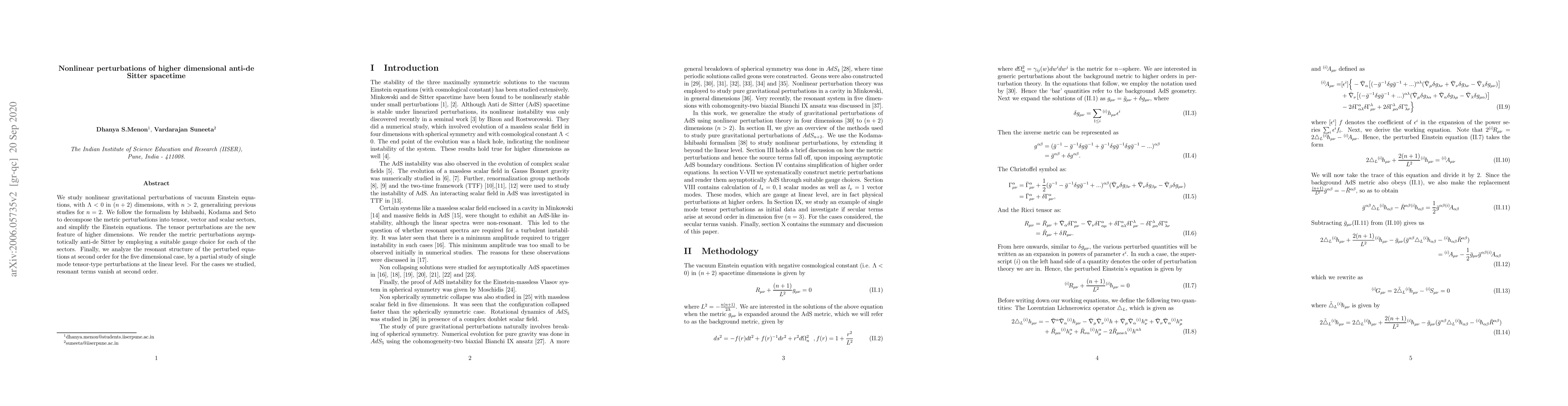 We study nonlinear gravitational perturbations of vacuum Einstein equations, with $\Lambda<0$ in $(n+2)$ dimensions, with $n>2$, generalizing previous studies for $n=2$. We follow the formalism by Ishibashi, Kodama and Seto to decompose the metric perturbations into tensor, vector and scalar sectors, and simplify the Einstein equations. The tensor perturbations are the new feature of higher dimensions. We render the metric perturbations asymptotically anti-de Sitter by employing a suitable gauge choice for each of the sectors. Finally, we analyze the resonant structure of the perturbed equations at second order for the five dimensional case, by a partial study of single mode tensor-type perturbations at the linear level. For the cases we studied, resonant terms vanish at second order.