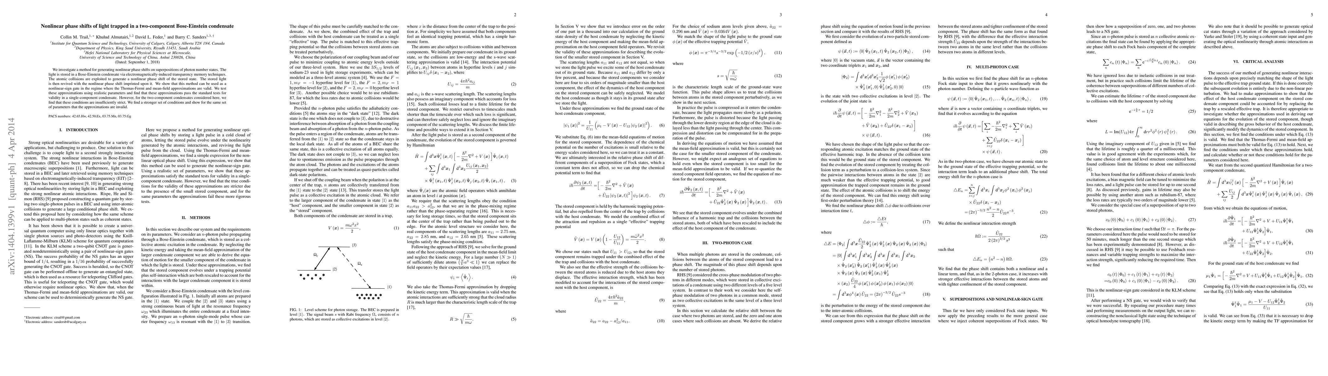 We investigate a method for generating nonlinear phase shifts on superpositions of photon number states. The light is stored in a Bose-Einstein condensate via electromagnetically-induced transparency memory techniques. The atomic collisions are exploited to generate a nonlinear phase shift of the stored state. The stored light is then revived with the nonlinear phase shift imprinted upon it. We show that this method can be used as a nonlinear-sign gate in the regime where the Thomas-Fermi and mean-field approximations are valid. We test these approximations using realistic parameters and find that these approximations pass the standard tests for validity in a single-component condensate. However, for the two-component condensates considered here, we find that these conditions are insufficiently strict. We find a stronger set of conditions and show for the same set of parameters that the approximations are invalid.