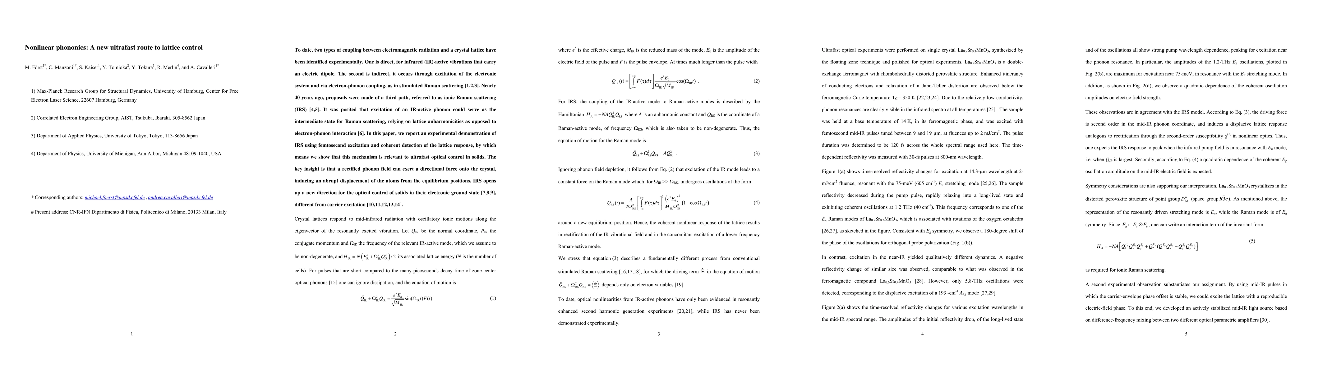 To date, two types of coupling between electromagnetic radiation and a crystal lattice have been identified experimentally. One is direct, for infrared (IR)-active vibrations that carry an electric dipole. The second is indirect, it occurs through intermediate excitation of the electronic system via electron-phonon coupling, as in stimulated Raman scattering. Nearly 40 years ago, proposals were made of a third path, referred to as ionic Raman scattering (IRS). It was posited that excitation of an IR-active phonon could serve as the intermediate state for a Raman scattering process relying on lattice anharmonicity as opposed to electron phonon interaction. In this paper, we report an experimental demonstration of ionic Raman scattering and show that this mechanism is relevant to optical control in solids. The key insight is that a rectified phonon field can exert a directional force onto the crystal, inducing an abrupt displacement of the atoms from the equilibrium positions that could not be achieved through excitation of an IR-active vibration alone, for which the force is oscillatory. IRS opens up a new direction for the coherent control of solids in their electronic ground state, different from approaches that rely on electronic excitations.