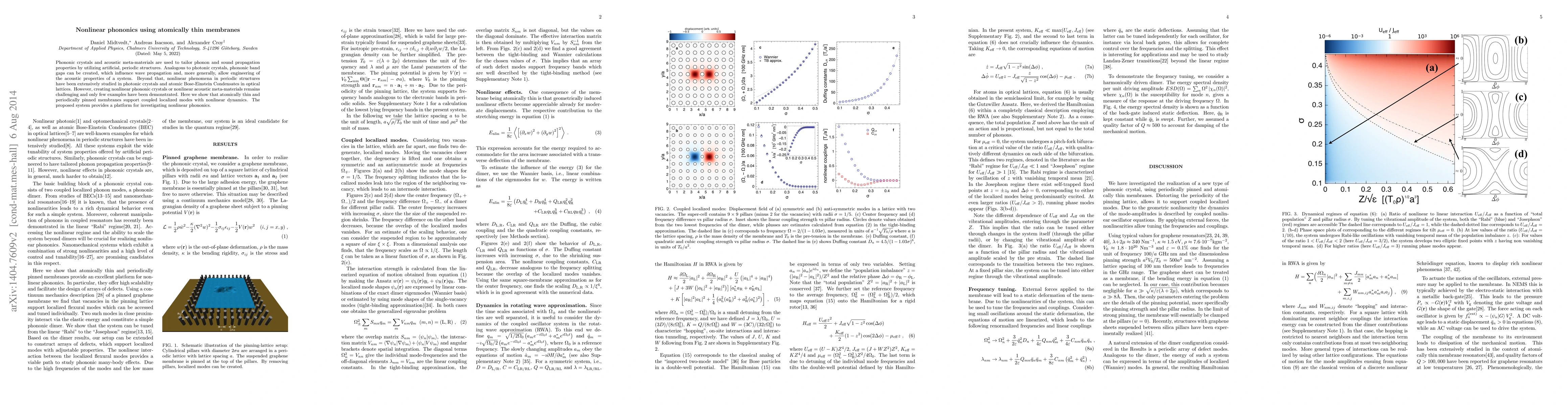 This paper demonstrates that atomically thin, periodically pinned membranes can support coupled localized modes with nonlinear dynamics, offering a new platform for exploring nonlinear phononics and engineering acoustic properties. The study highlights the potential of such systems to create phononic band gaps and manipulate wave propagation.