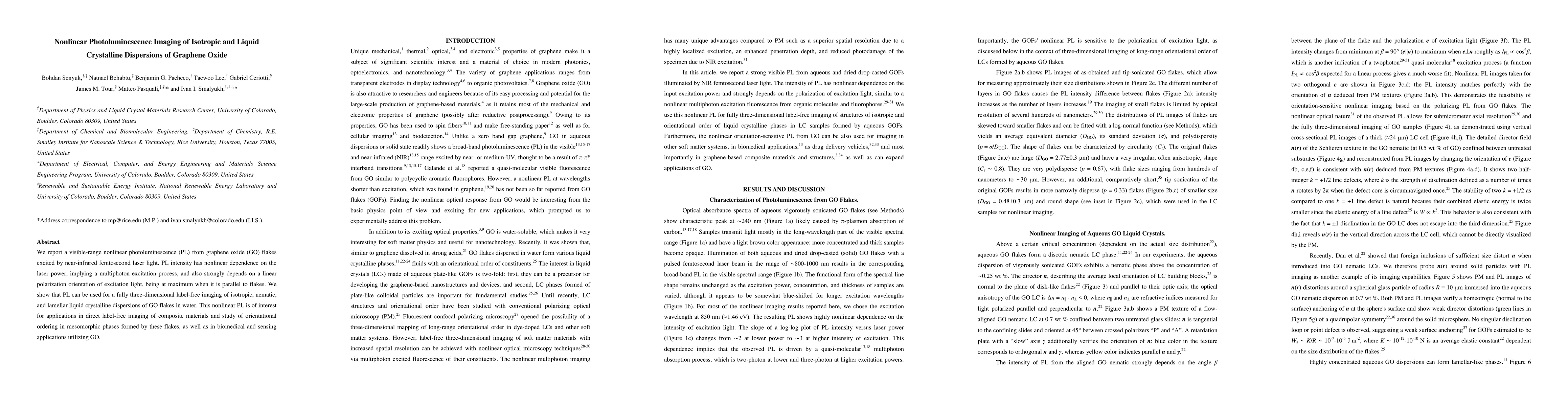 This paper reports on nonlinear photoluminescence from graphene oxide flakes excited by near-infrared femtosecond laser light, revealing multiphoton excitation and polarization-dependent effects. The technique enables three-dimensional label-free imaging of isotropic and liquid crystalline dispersions, with potential applications in composite material analysis and biomedical sensing.