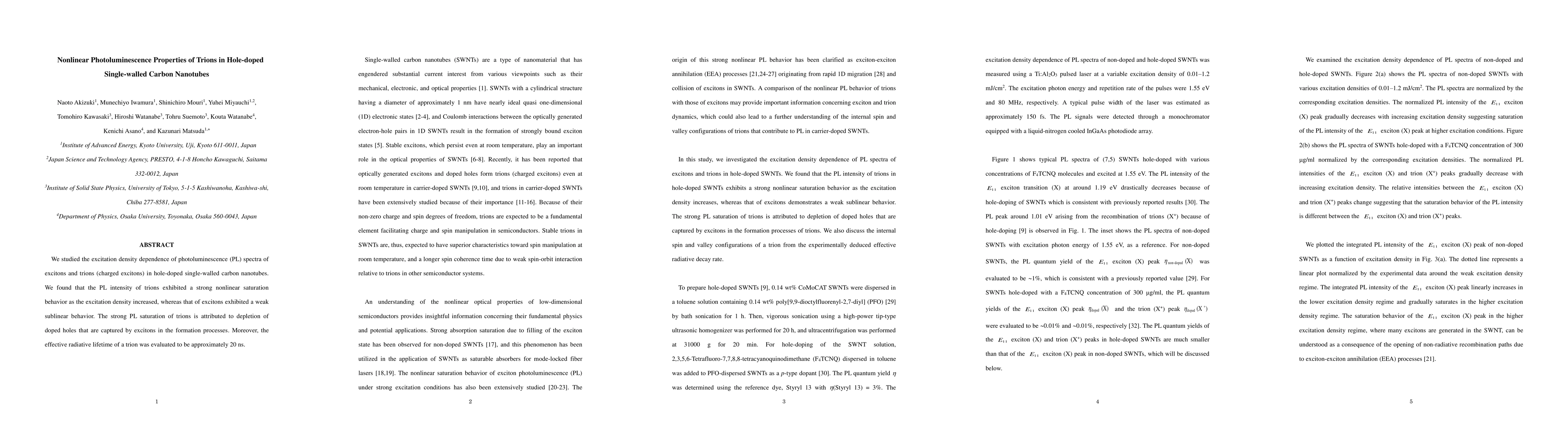 Summary: This study investigates the nonlinear photoluminescence properties in hole-doped single-walled carbon nanotubes, revealing strong nonlinear saturation in trion PL intensity and weak sublinear behavior in exciton PL intensity due to hole depletion, with a trion radiative lifetime of about 20 ns.