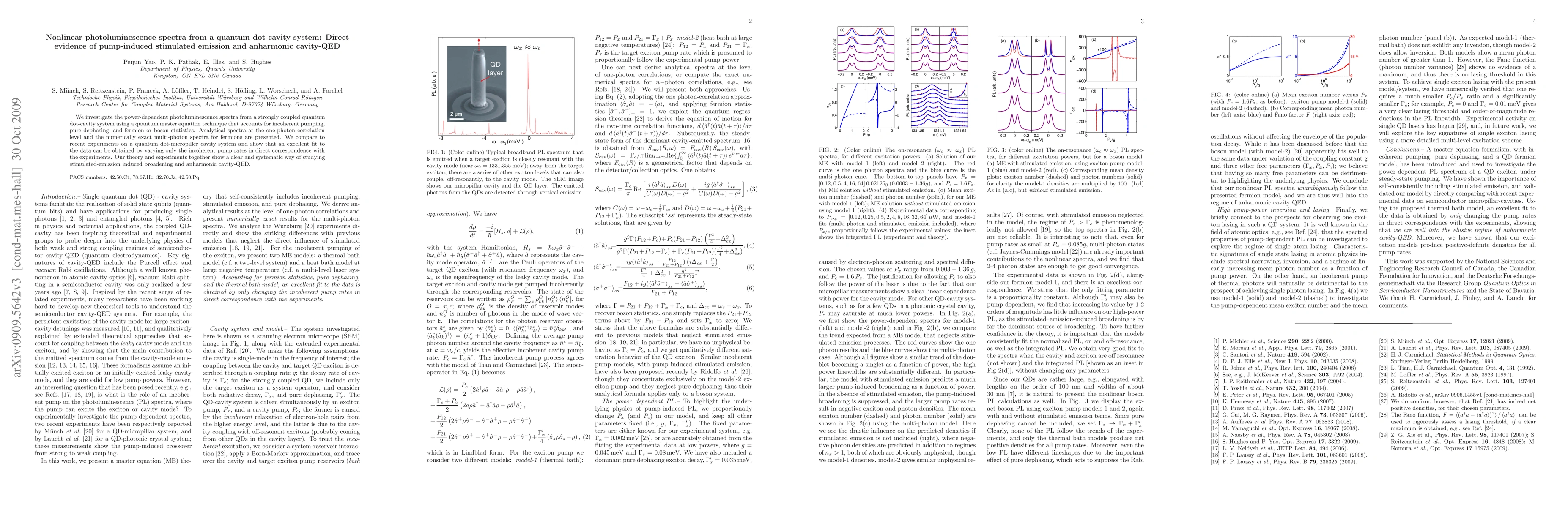This research presents a detailed study of the photoluminescence spectra in a quantum dot-cavity system, revealing evidence of pump-induced stimulated emission through analytical and numerical analysis. The study aligns theoretical models with experimental data, highlighting the impact of incoherent pump rates on spectral broadening and demonstrating anharmonic cavity-QED effects.