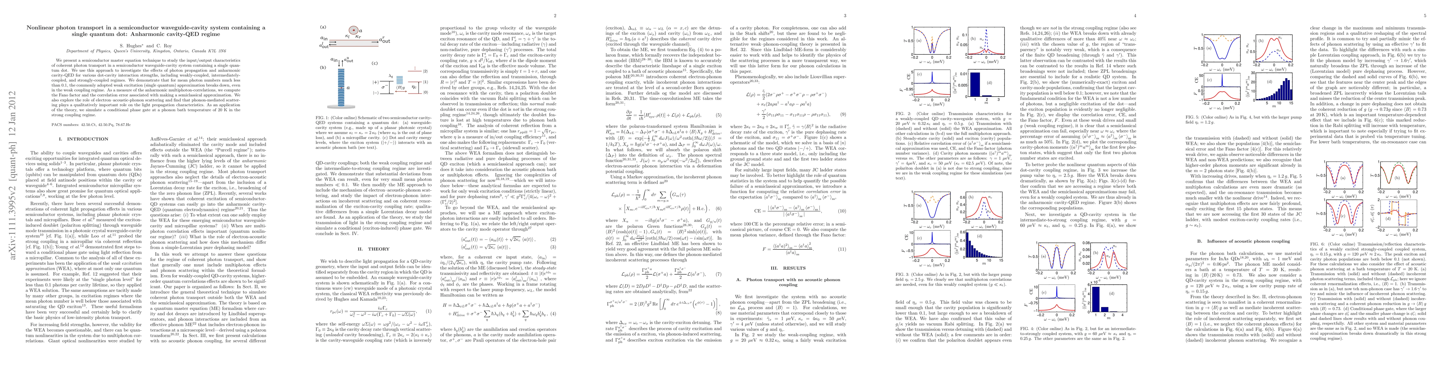 We present a semiconductor master equation technique to study the input/output characteristics of coherent photon transport in a semiconductor waveguide-cavity system containing a single quantum dot. We use this approach to investigate the effects of photon propagation and anharmonic cavity-QED for various dot-cavity interaction strengths, including weakly-coupled, intermediately-coupled, and strongly-coupled regimes. We demonstrate that for mean photon numbers much less than 0.1, the commonly adopted weak excitation (single quantum) approximation breaks down, even in the weak coupling regime. As a measure of the anharmonic multiphoton-correlations, we compute the Fano factor and the correlation error associated with making a semiclassical approximation. We also explore the role of electron--acoustic-phonon scattering and find that phonon-mediated scattering plays a qualitatively important role on the light propagation characteristics. As an application of the theory, we simulate a conditional phase gate at a phonon bath temperature of $20 $K in the strong coupling regime.