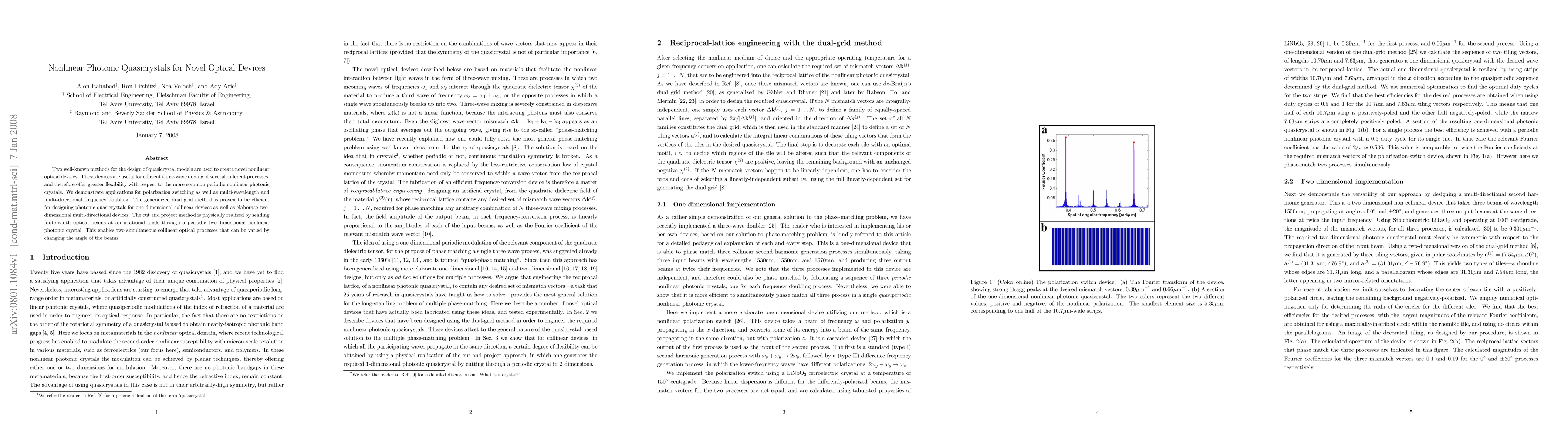 Two well-known methods for the design of quasicrystal models are used to create novel nonlinear optical devices. These devices are useful for efficient three-wave mixing of several different processes, and therefore offer greater flexibility with respect to the more common periodic nonlinear photonic crystals. We demonstrate applications for polarization switching as well as multi-wavelength and multi-directional frequency doubling. The generalized dual grid method is proven to be efficient for designing photonic quasicrystals for one-dimensional collinear devices as well as elaborate two-dimensional multi-directional devices. The cut and project method is physically realized by sending finite-width optical beams at an irrational angle through a periodic two-dimensional nonlinear photonic crystal. This enables two simultaneous collinear optical processes that can be varied by changing the angle of the beams.