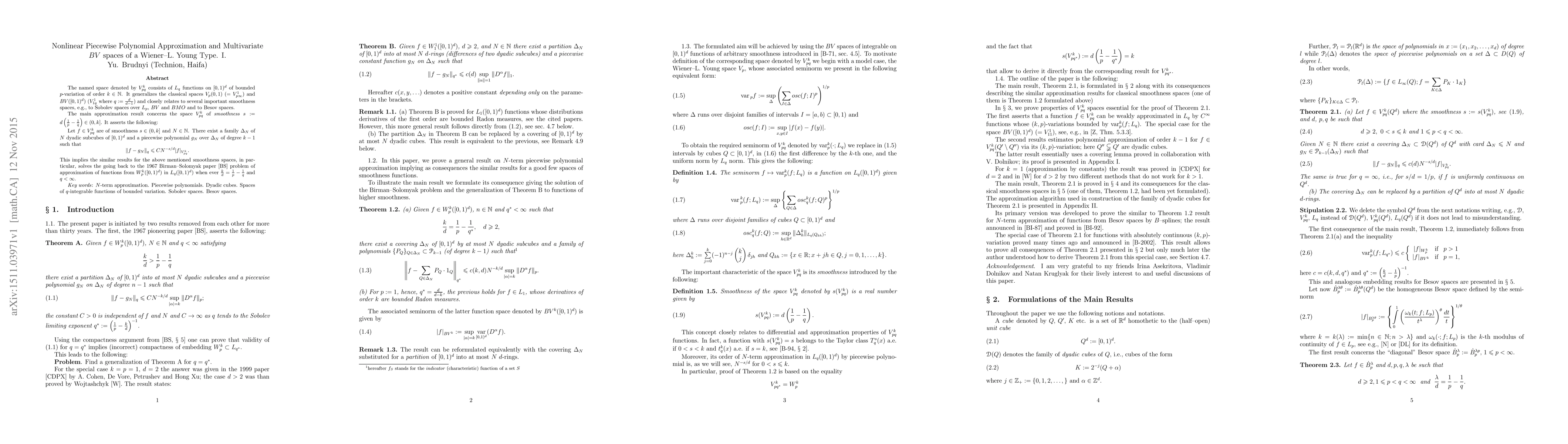 This paper introduces the space $V_{pq}^k$, a generalization of classical spaces like $V_p(0,1)$ and $BV([0,1)^d)$, which relates to important smoothness spaces such as Sobolev, $BV$, $BMO$, and Besov spaces. The main result provides a nonlinear piecewise polynomial approximation for functions in $V_{pq}^k$ of smoothness $s$, with an error bound proportional to $N^{-s/d}$, solving a long-standing approximation problem for $W_p^k([0,1)^d)$ in $L_q([0,1)^d)$ under specific conditions on $p$, $q$, and $k$.