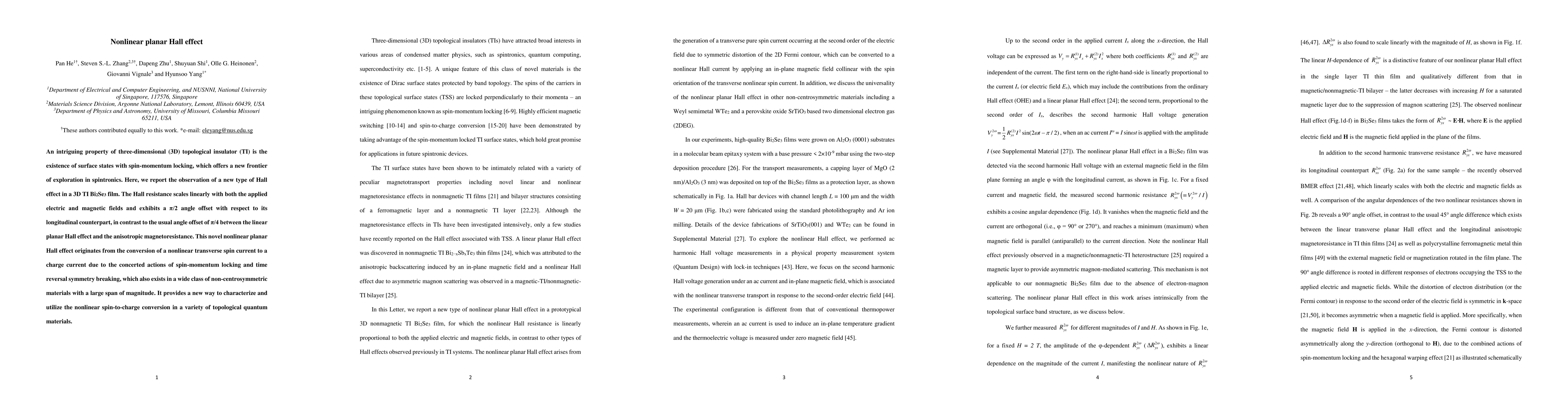 An intriguing property of three-dimensional (3D) topological insulator (TI) is the existence of surface states with spin-momentum locking, which offers a new frontier of exploration in spintronics. Here, we report the observation of a new type of Hall effect in a 3D TI Bi2Se3 film. The Hall resistance scales linearly with both the applied electric and magnetic fields and exhibits a {\pi}/2 angle offset with respect to its longitudinal counterpart, in contrast to the usual angle offset of {\pi}/4 between the linear planar Hall effect and the anisotropic magnetoresistance. This novel nonlinear planar Hall effect originates from the conversion of a nonlinear transverse spin current to a charge current due to the concerted actions of spin-momentum locking and time reversal symmetry breaking, which also exists in a wide class of non-centrosymmetric materials with a large span of magnitude. It provides a new way to characterize and utilize the nonlinear spin-to-charge conversion in a variety of topological quantum materials.