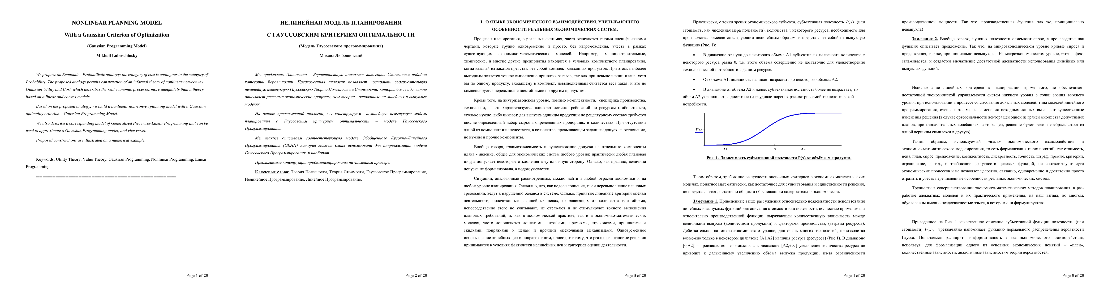 We propose an Economic - Probabilistic analogy: the category of cost is analogous to the category of Probability. The proposed analogy permits construction of an informal theory of nonlinear non-convex Gaussian Utility and Cost, which describes the real economic processes more adequately than a theory based on a linear and convex models. Based on the proposed analogy, we build a nonlinear non-convex planning model with a Gaussian optimality criterion - Gaussian Programming Model. We also describe a corresponding model of Generalized Piecewise-Linear Programming that can be used to approximate a Gaussian Programming model, and vice verse. Proposed constructions are illustrated on a numerical example.
