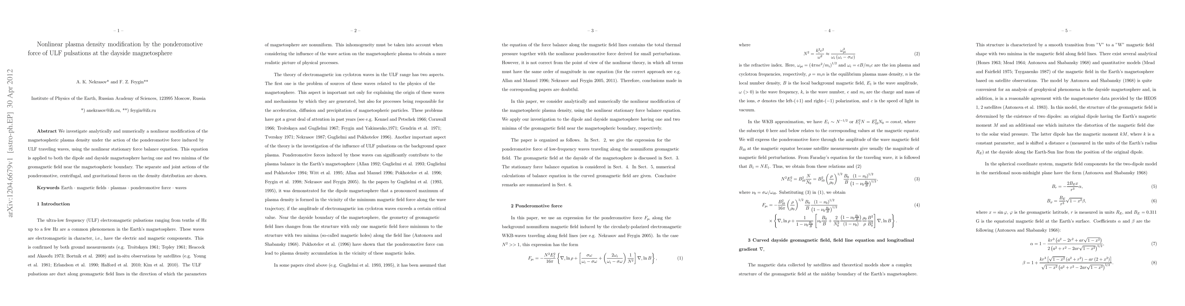 This paper examines the nonlinear modification of magnetospheric plasma density due to the ponderomotive force from ULF pulsations, employing both analytical and numerical methods. It highlights the combined effects of ponderomotive, centrifugal, and gravitational forces on plasma density distribution in the dayside magnetosphere.