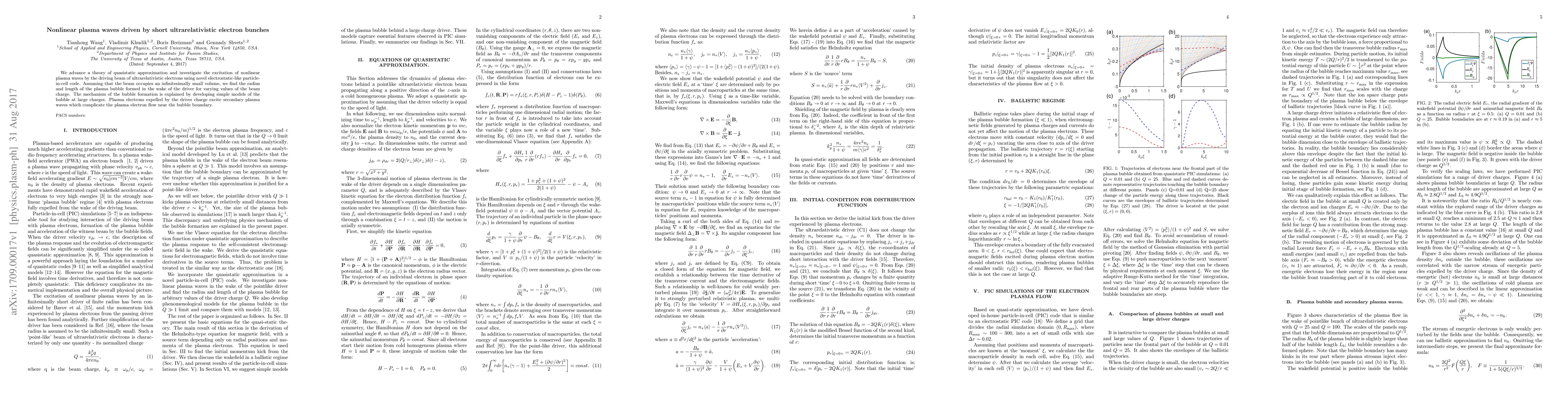 This research develops a quasistatic approximation theory to study nonlinear plasma waves driven by short ultrarelativistic electron bunches, revealing the formation and characteristics of plasma bubbles in the wake of the driver for varying beam charges. It also explains the mechanism of plasma bubble formation and the resultant secondary plasma waves complicating electron flow near the bubble boundary.