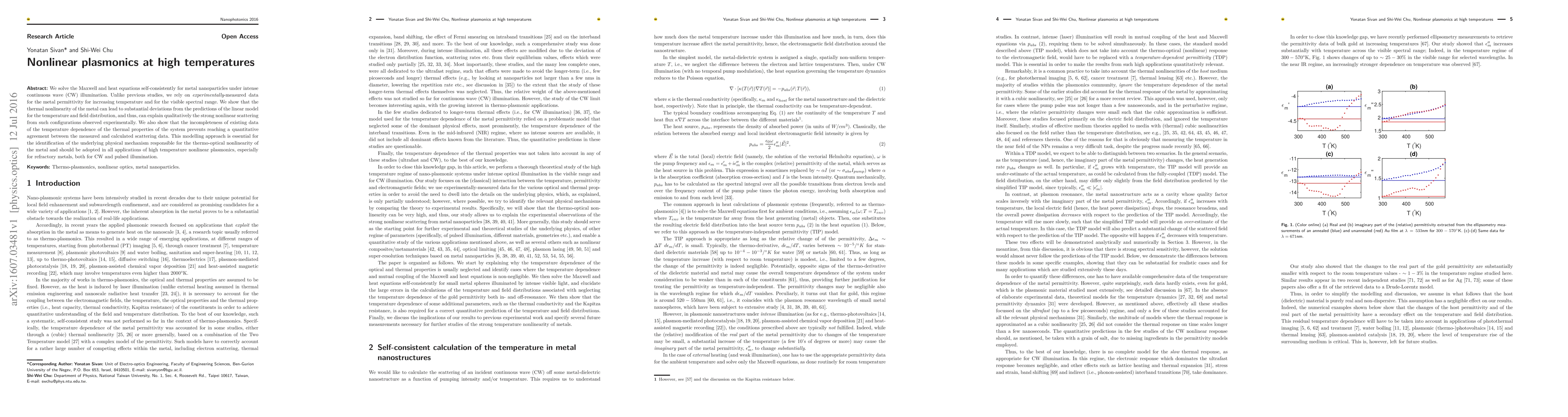 We solve the Maxwell and heat equations self-consistently for metal nanoparticles under intense continuous wave (CW) illumination. Unlike previous studies, we rely on {\em experimentally}-measured data for the metal permittivity for increasing temperature and for the visible spectral range. We show that the thermal nonlinearity of the metal can lead to substantial deviations from the predictions of the linear model for the temperature and field distribution, and thus, can explain qualitatively the strong nonlinear scattering from such configurations observed experimentally. We also show that the incompleteness of existing data of the temperature dependence of the thermal properties of the system prevents reaching a quantitative agreement between the measured and calculated scattering data. This modelling approach is essential for the identification of the underlying physical mechanism responsible for the thermo-optical nonlinearity of the metal and should be adopted in all applications of high temperature nonlinear plasmonics, especially for refractory metals, both for CW and pulsed illumination.