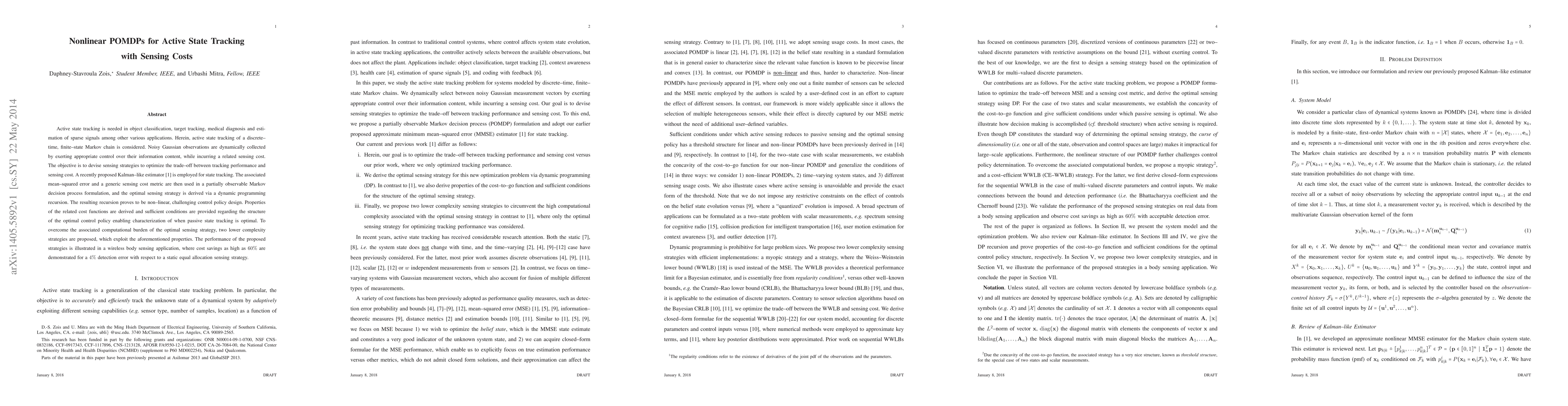 Active state tracking is needed in object classification, target tracking, medical diagnosis and estimation of sparse signals among other various applications. Herein, active state tracking of a discrete-time, finite-state Markov chain is considered. Noisy Gaussian observations are dynamically collected by exerting appropriate control over their information content, while incurring a related sensing cost. The objective is to devise sensing strategies to optimize the trade-off between tracking performance and sensing cost. A recently proposed Kalman-like estimator \cite{ZoisTSP14} is employed for state tracking. The associated mean-squared error and a generic sensing cost metric are then used in a partially observable Markov decision process formulation, and the optimal sensing strategy is derived via a dynamic programming recursion. The resulting recursion proves to be non-linear, challenging control policy design. Properties of the related cost functions are derived and sufficient conditions are provided regarding the structure of the optimal control policy enabling characterization of when passive state tracking is optimal. To overcome the associated computational burden of the optimal sensing strategy, two lower complexity strategies are proposed, which exploit the aforementioned properties. The performance of the proposed strategies is illustrated in a wireless body sensing application, where cost savings as high as $60\%$ are demonstrated for a $4\%$ detection error with respect to a static equal allocation sensing strategy.