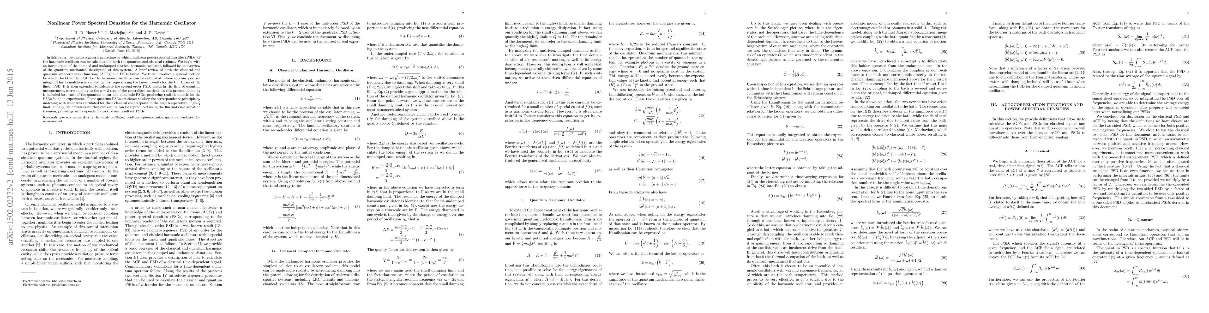 In this paper, we discuss a general procedure by which nonlinear power spectral densities (PSDs) of the harmonic oscillator can be calculated in both the quantum and classical regimes. We begin with an introduction of the damped and undamped classical harmonic oscillator, followed by an overview of the quantum mechanical description of this system. A brief review of both the classical and quantum autocorrelation functions (ACFs) and PSDs follow. We then introduce a general method by which the kth-order PSD for the harmonic oscillator can be calculated, where $k$ is any positive integer. This formulation is verified by first reproducing the known results for the $k = 1$ case of the linear PSD. It is then extended to calculate the second-order PSD, useful in the field of quantum measurement, corresponding to the $k = 2$ case of the generalized method. In this process, damping is included into each of the quantum linear and quadratic PSDs, producing realistic models for the PSDs found in experiment. These quantum PSDs are shown to obey the correspondence principle by matching with what was calculated for their classical counterparts in the high temperature, high-Q limit. Finally, we demonstrate that our results can be reproduced using the fluctuation-dissipation theorem, providing an independent check of our resultant PSDs.