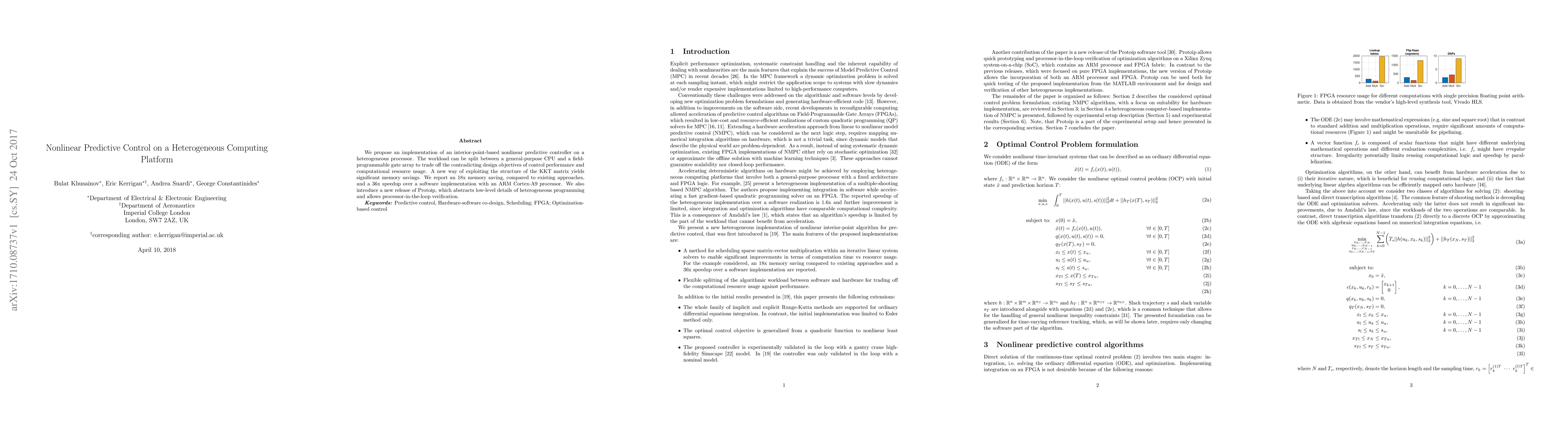 We propose an implementation of an interior-point-based nonlinear predictive controller on a heterogeneous processor. The workload can be split between a general-purpose CPU and a field-programmable gate array to trade off the contradicting design objectives of control performance and computational resource usage. A new way of exploiting the structure of the KKT matrix yields significant memory savings. We report an 18x memory saving, compared to existing approaches, and a 36x speedup over a software implementation with an ARM Cortex-A9 processor. We also introduce a new release of Protoip, which abstracts low-level details of heterogeneous programming and allows processor-in-the-loop verification.