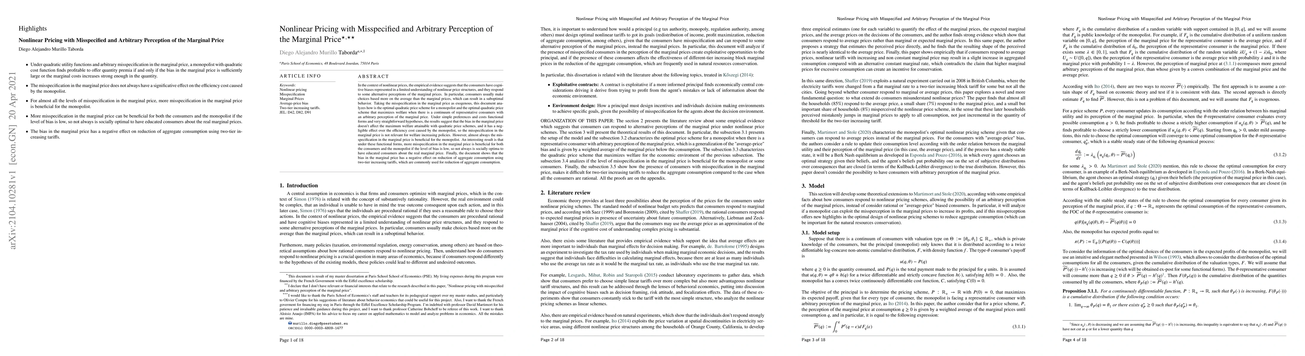 This paper examines nonlinear pricing strategies under consumer misperception of marginal prices, finding that cognitive biases lead to suboptimal consumer behavior. It concludes that while the monopolist benefits from such misperceptions, the welfare gains from quadratic pricing schemes are unaffected by these biases, suggesting that welfare-improving policies may not need to correct for marginal price misspecification.