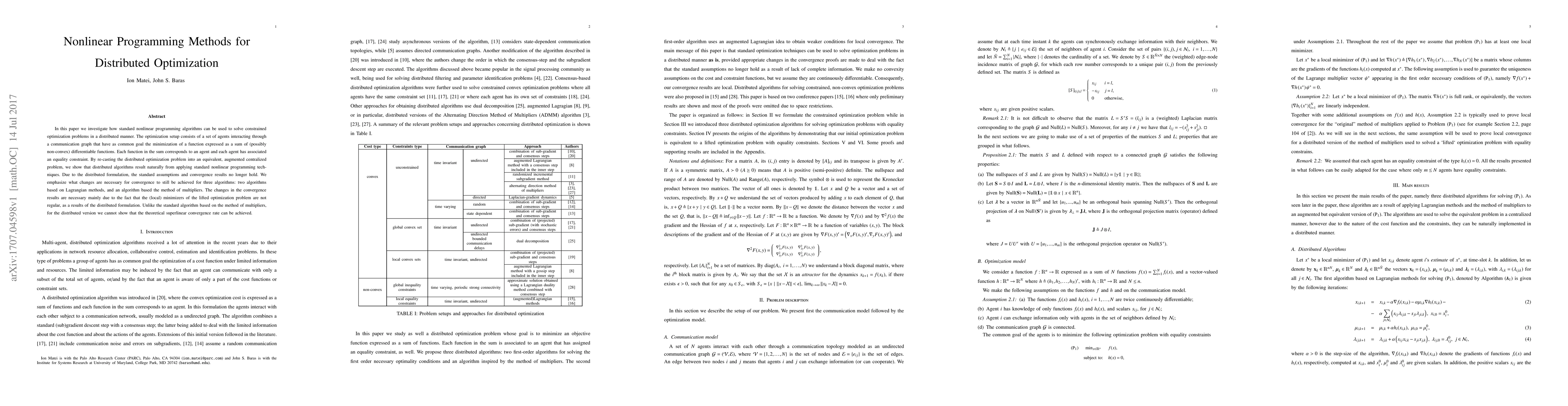 In this paper we investigate how standard nonlinear programming algorithms can be used to solve constrained optimization problems in a distributed manner. The optimization setup consists of a set of agents interacting through a communication graph that have as common goal the minimization of a function expressed as a sum of (possibly non-convex) differentiable functions. Each function in the sum corresponds to an agent and each agent has associated an equality constraint. By re-casting the distributed optimization problem into an equivalent, augmented centralized problem, we show that distributed algorithms result naturally from applying standard nonlinear programming techniques. Due to the distributed formulation, the standard assumptions and convergence results no longer hold. We emphasize what changes are necessary for convergence to still be achieved for three algorithms: two algorithms based on Lagrangian methods, and an algorithm based the method of multipliers. The changes in the convergence results are necessary mainly due to the fact that the (local) minimizers of the lifted optimization problem are not regular, as a results of the distributed formulation. Unlike the standard algorithm based on the method of multipliers, for the distributed version we cannot show that the theoretical superlinear convergence rate can be achieved.