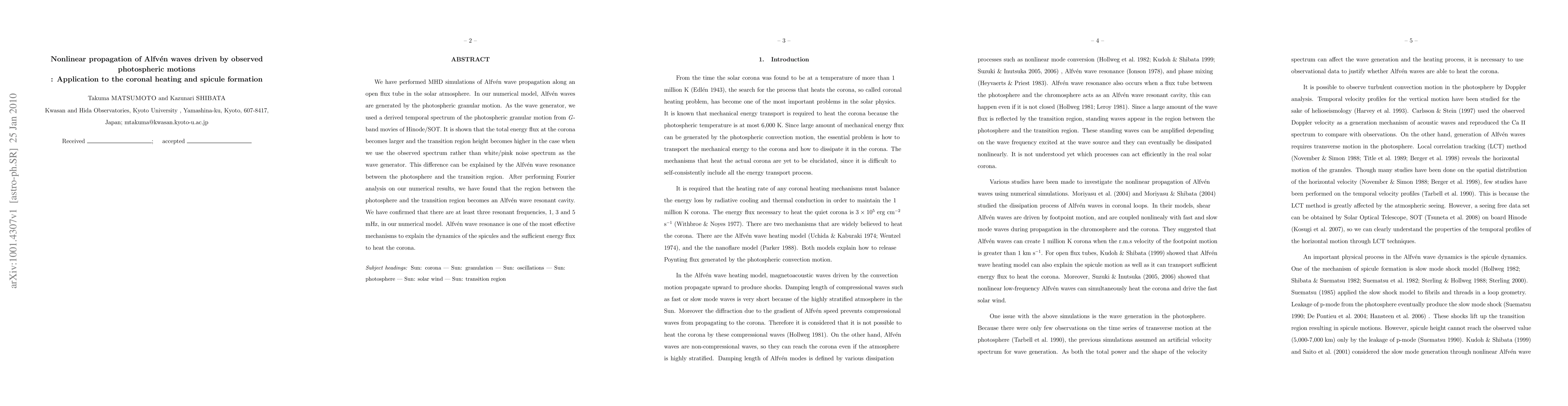 We have performed MHD simulations of Alfven wave propagation along an open flux tube in the solar atmosphere. In our numerical model, Alfven waves are generated by the photospheric granular motion. As the wave generator, we used a derived temporal spectrum of the photospheric granular motion from G-band movies of Hinode/SOT. It is shown that the total energy flux at the corona becomes larger and the transition region height becomes higher in the case when we use the observed spectrum rather than white/pink noise spectrum as the wave generator. This difference can be explained by the Alfven wave resonance between the photosphere and the transition region. After performing Fourier analysis on our numerical results, we have found that the region between the photosphere and the transition region becomes an Alfven wave resonant cavity. We have confirmed that there are at least three resonant frequencies, 1, 3 and 5 mHz, in our numerical model. Alfven wave resonance is one of the most effective mechanisms to explain the dynamics of the spicules and the sufficient energy flux to heat the corona.