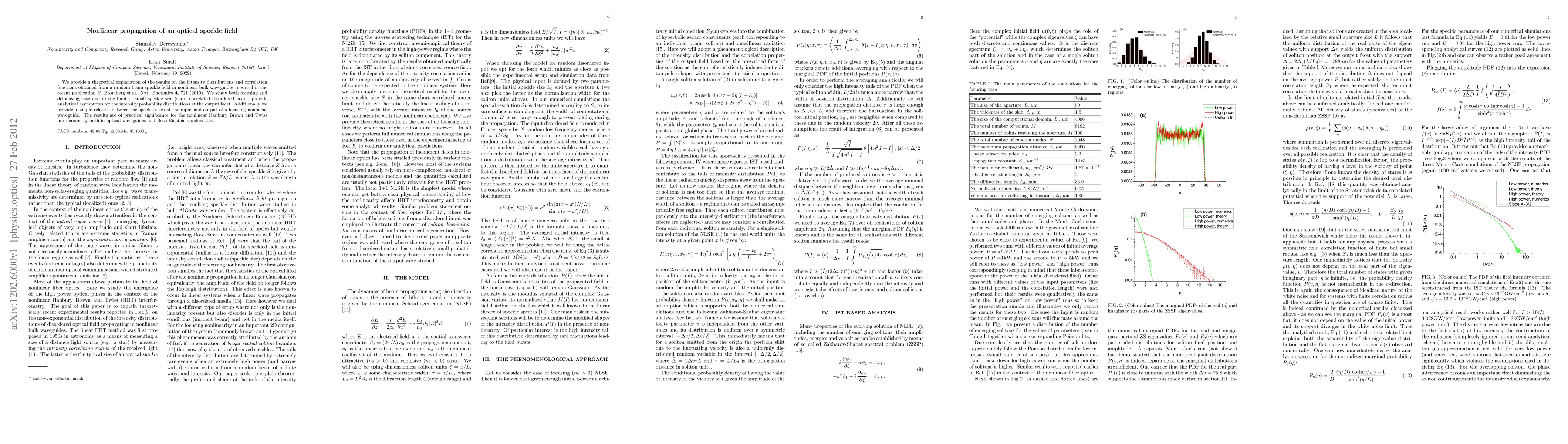 We provide a theoretical explanation of the results on the intensity distributions and correlation functions obtained from a random beam speckle field in nonlinear bulk waveguides reported in the recent publication Y. Bromberg et.al., Nat. Photonics \textbf{4}, 721 (2010). We study both focusing and defocusing case and in the limit of small speckle size (short correlated disordered beam) provide analytical asymptotes for the intensity probability distributions at the output facet. Additionally we provide a simple relation between the speckle sizes at the input and output of a focusing nonlinear waveguide. The results are of practical significance for the nonlinear Hanbury Brown and Twiss interferometry both in optical waveguides and Bose-Einstein condensates.