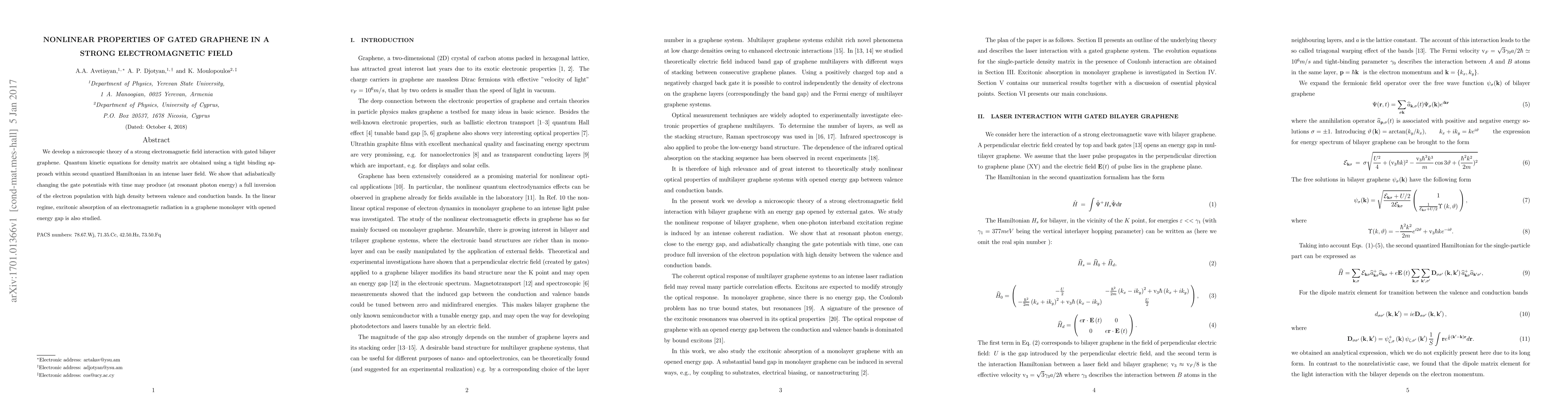 This paper develops a microscopic theory for the interaction of gated bilayer graphene with strong electromagnetic fields, showing that changing gate potentials can lead to electron population inversion between bands. It also explores excitonic absorption in graphene monolayers under intense laser fields.