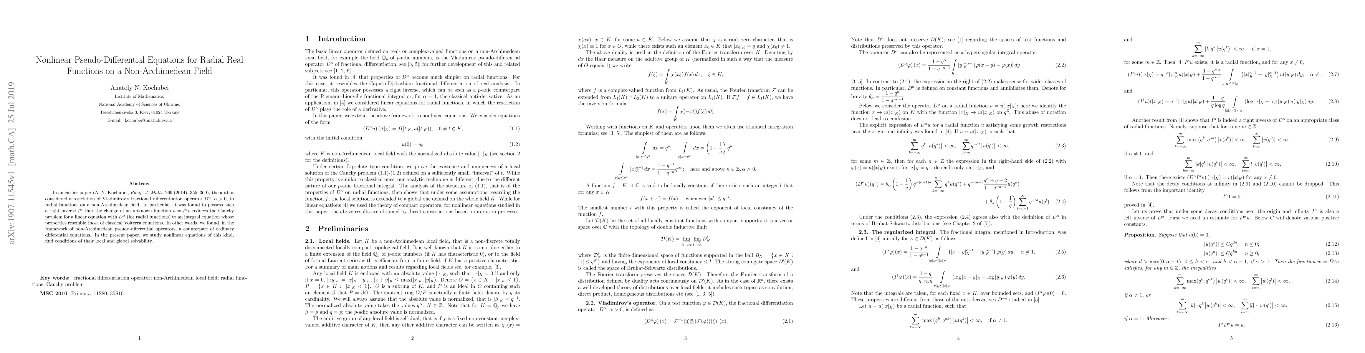 In an earlier paper (A. N. Kochubei, {\it Pacif. J. Math.} 269 (2014), 355--369), the author considered a restriction of Vladimirov's fractional differentiation operator $D^\alpha$, $\alpha >0$, to radial functions on a non-Archimedean field. In particular, it was found to possess such a right inverse $I^\alpha$ that the change of an unknown function $u=I^\alpha v$ reduces the Cauchy problem for a linear equation with $D^\alpha$ (for radial functions) to an integral equation whose properties resemble those of classical Volterra equations. In other words, we found, in the framework of non-Archimedean pseudo-differential operators, a counterpart of ordinary differential equations. In the present paper, we study nonlinear equations of this kind, find conditions of their local and global solvability.