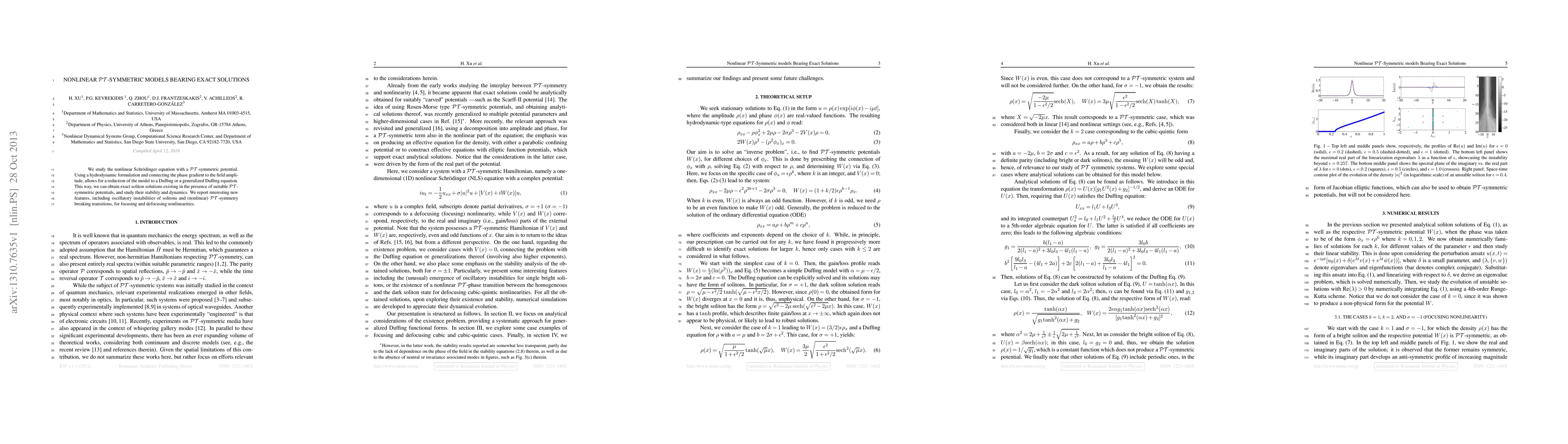 This research explores the nonlinear Schrödinger equation with PT-symmetric potentials, reducing the model to Duffing equations for exact soliton solutions. It uncovers unique features like oscillatory soliton instabilities and nonlinear PT-symmetry breaking transitions for both focusing and defocusing nonlinearities.