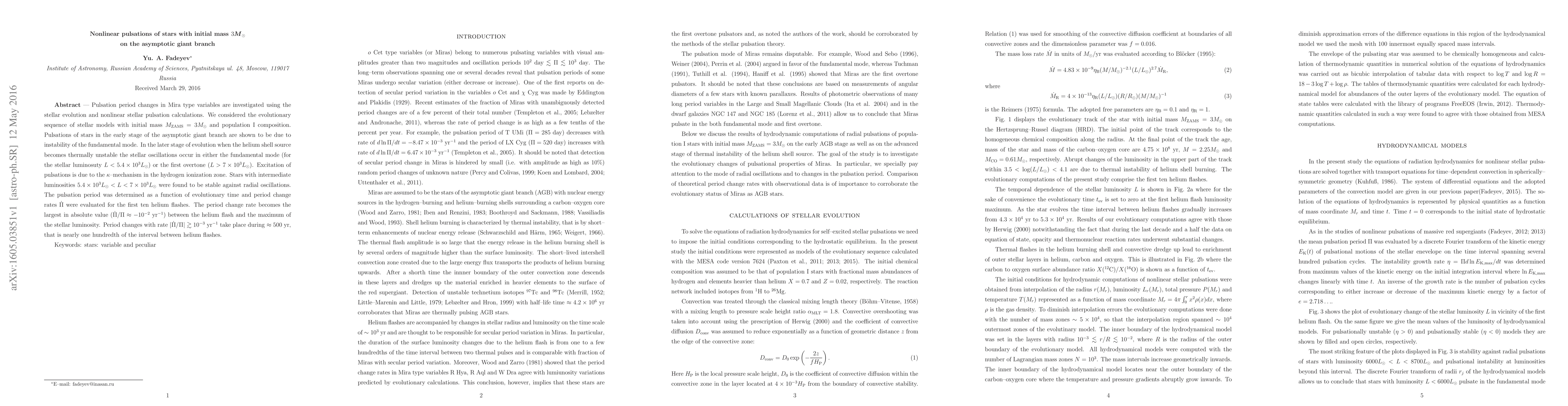 This paper investigates the nonlinear pulsations of stars with an initial mass of 3 solar masses on the asymptotic giant branch, showing that early-stage pulsations are due to fundamental mode instability, while later stages exhibit oscillations either in the fundamental mode or first overtone depending on luminosity. The kappa-mechanism drives pulsations in the hydrogen ionization zone, with significant period changes occurring around helium flashes.