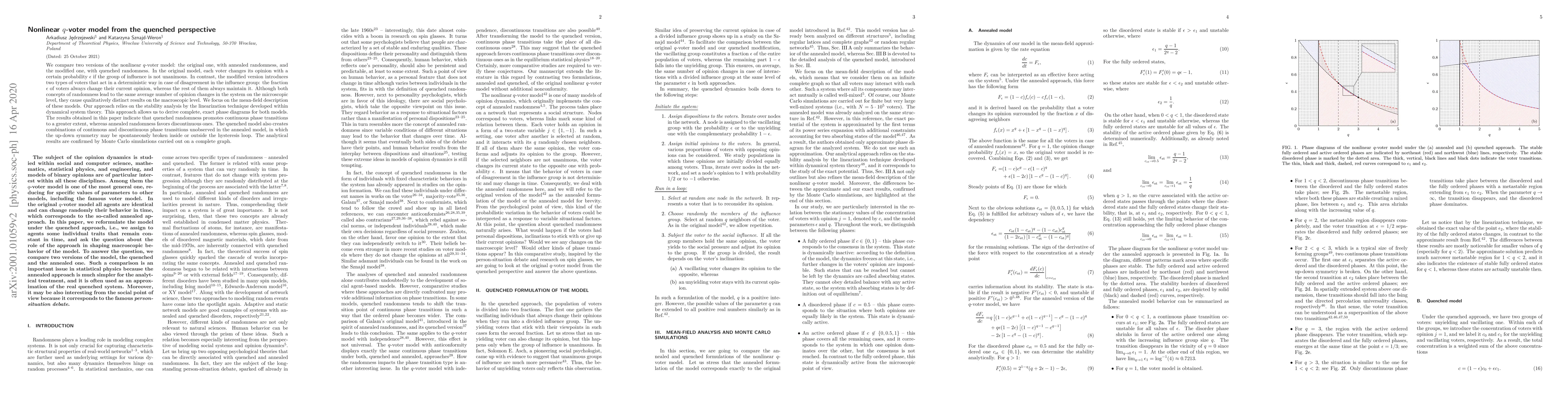 The nonlinear q-voter model exhibits distinct phase transitions in response to quenched versus annealed randomness, with quenched randomness promoting continuous transitions and annealed randomness favoring discontinuous ones.