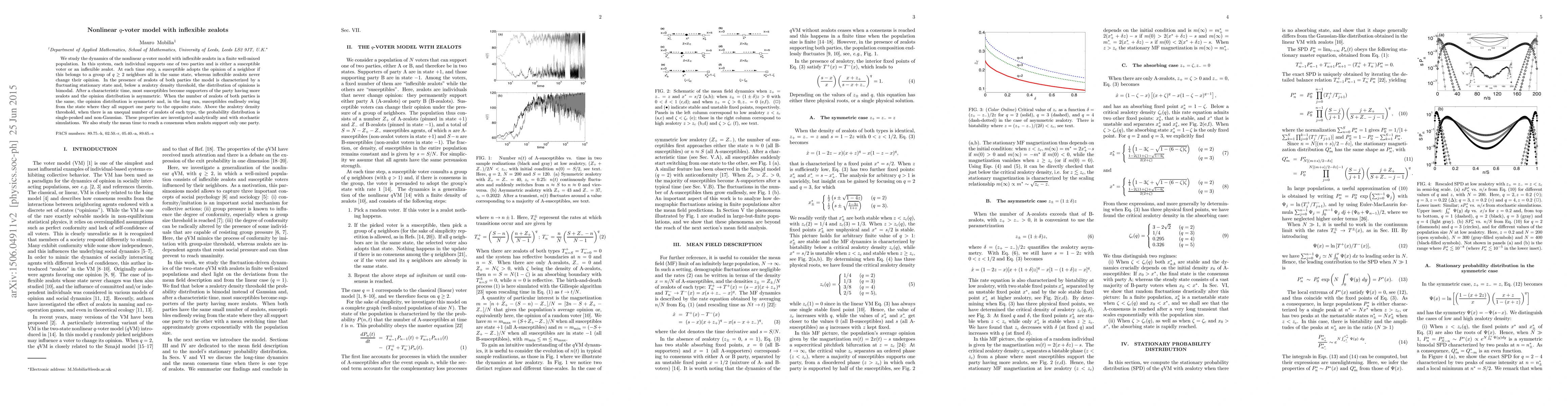 This paper investigates the dynamics of the nonlinear $q$-voter model with inflexible zealots, showing that the presence of zealots leads to fluctuating stationary states and bimodal opinion distributions below a threshold. Above the threshold, consensus is reached favoring the party with more zealots, with asymmetric distributions.