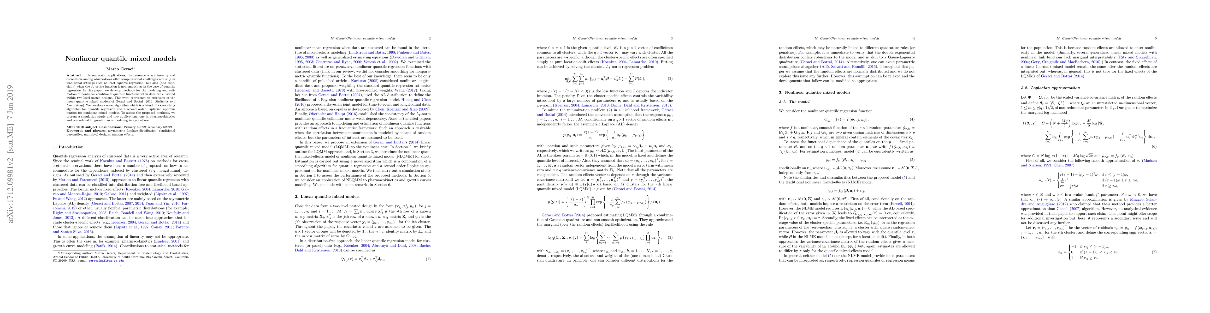 This paper develops methods for estimating nonlinear conditional quantile functions in clustered data using a blend of quantile regression smoothing and nonlinear mixed models. The proposed algorithm is evaluated through simulations and applied in pharmacokinetics and agricultural growth curve modeling.